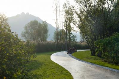 針對地幅闊大綿長的外灘區(qū)域,設計通過地形的塑造、植物疏朗關系的調整、密植組團與道路的圍合、停駐場地的打造以及特色旱溪的營造,提供了豐富多樣的視覺感官體驗。使游客在游覽的過程中,既能感受到山河磅礴的壯麗,又能有游園細節(jié)上的回味。