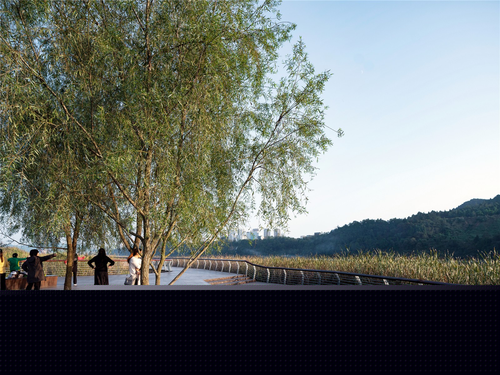 In order to create a more complete ecosystem, at the beginning of the planning, the design breaks the barriers of solid boundaries and fully considers the combination of the riverside belt and the urban waterfront park.It builds a deep forest line from the inside to the outside of the riverside tidal flat-wetland system-primary forest-artificial garden area-urban boundary, allowing nature to more perfectly integrate with the city.