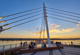 A notably sustainable feature of the park is the Grant Street Pier, a cable-stayed structure projecting more than 30 metres over the water. The concept emerged from the enduring spirit and function of the river, conveying recreational and industrial vessels. The form was designed with an open centre—and without in-water structures—to maintain unhindered aquatic species migration and minimize disruption of the riverbed. Visitors are granted the chance to feel the exhilaration of being out on the water without ever having left land.