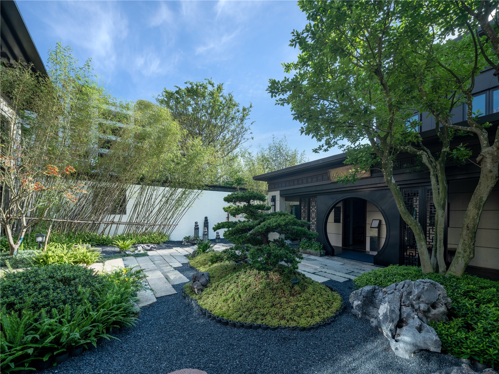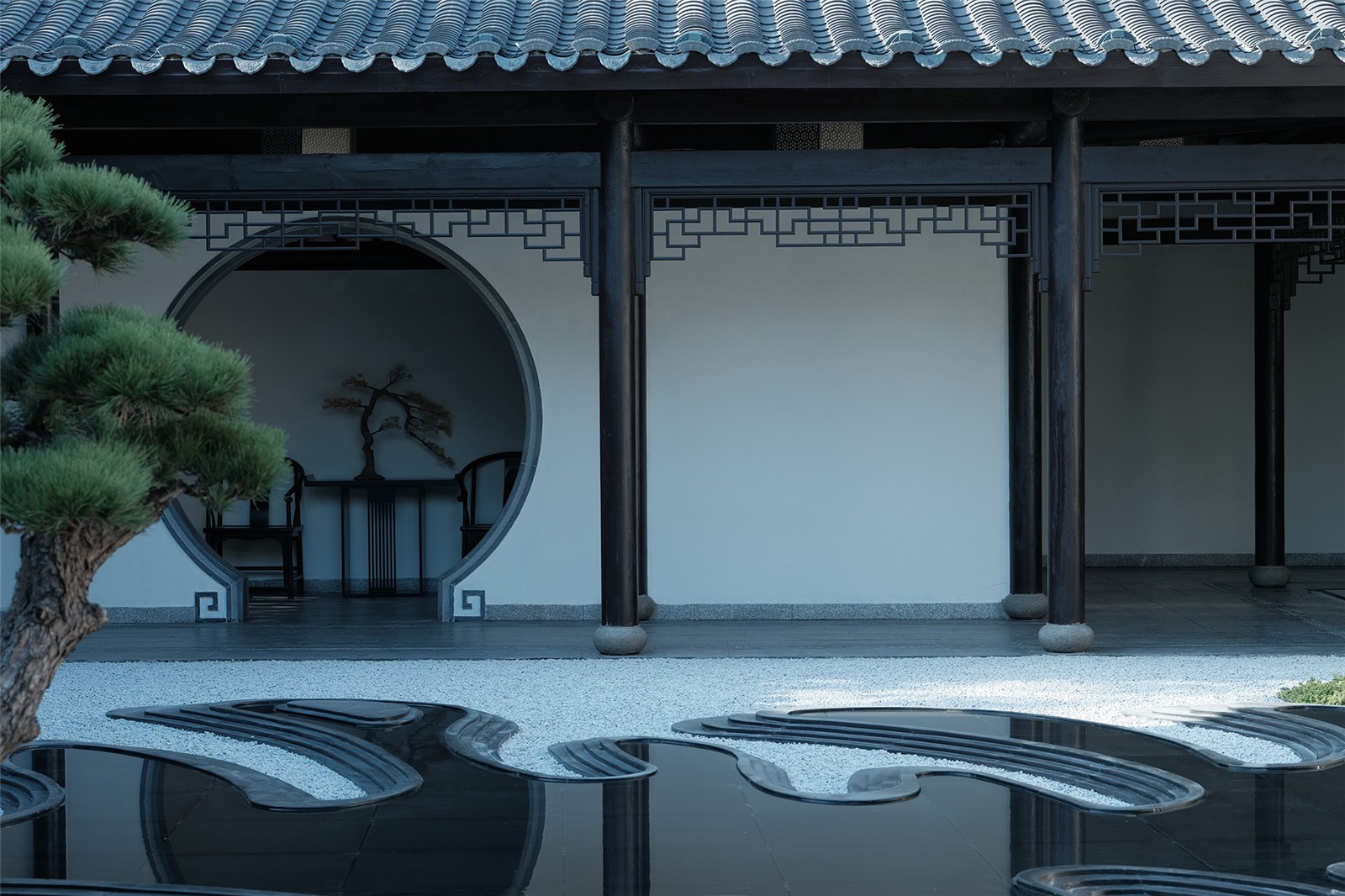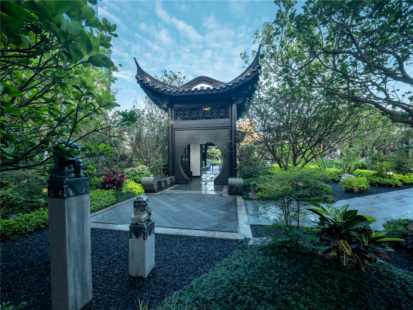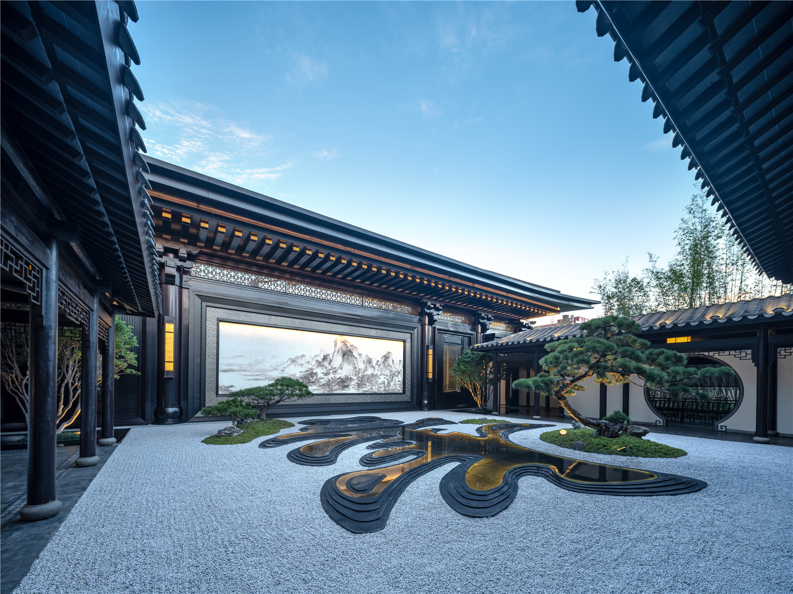 鳳凰齊飛,鳴如簫笙,音如鐘鼓。一進(jìn)院的雙鳳朝陽地雕暗合珠海鳳凰山,旨在把當(dāng)?shù)匚幕谌氡痉桨钢?,寓意吉祥和諧,登門大吉。入口門樓尊崇儒家禮制,門樓兩側(cè)的“水墨江山圖”下置石點(diǎn)綴其側(cè),再配以造型松、礫石、漣漪、青瓦,構(gòu)成一副立體的山水畫卷,呈現(xiàn)一個(gè)專屬的新中式美學(xué)作品。