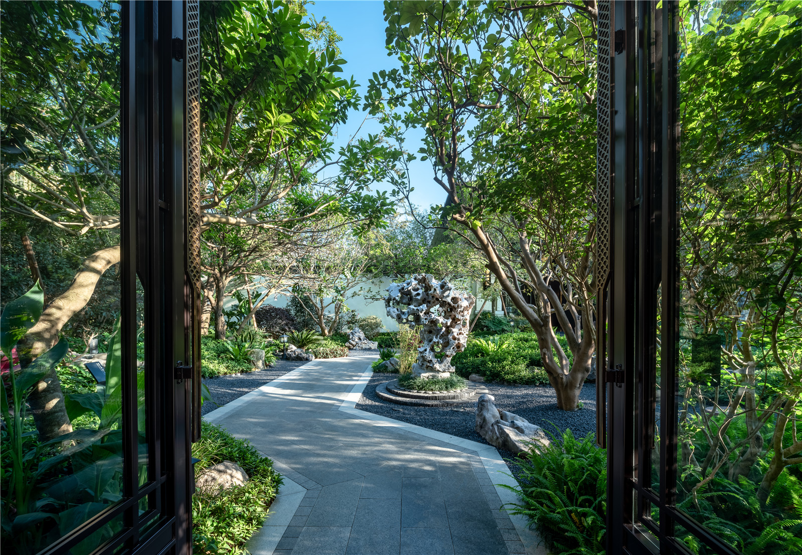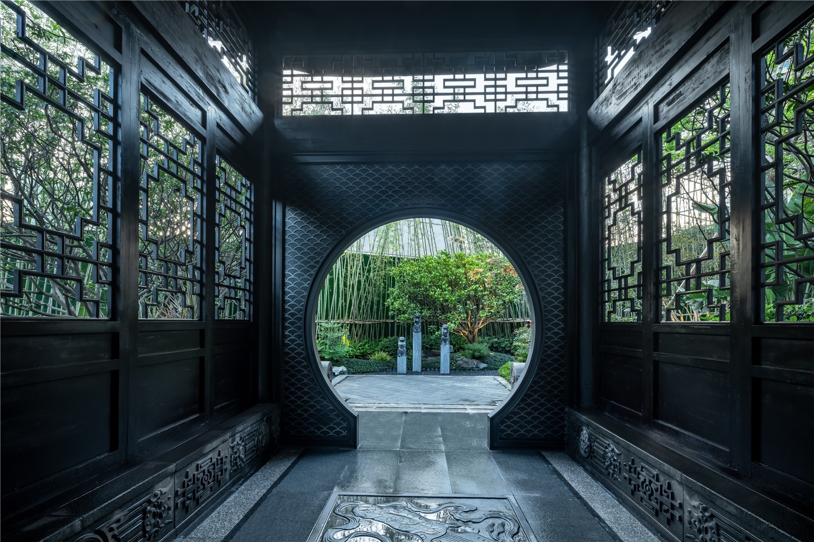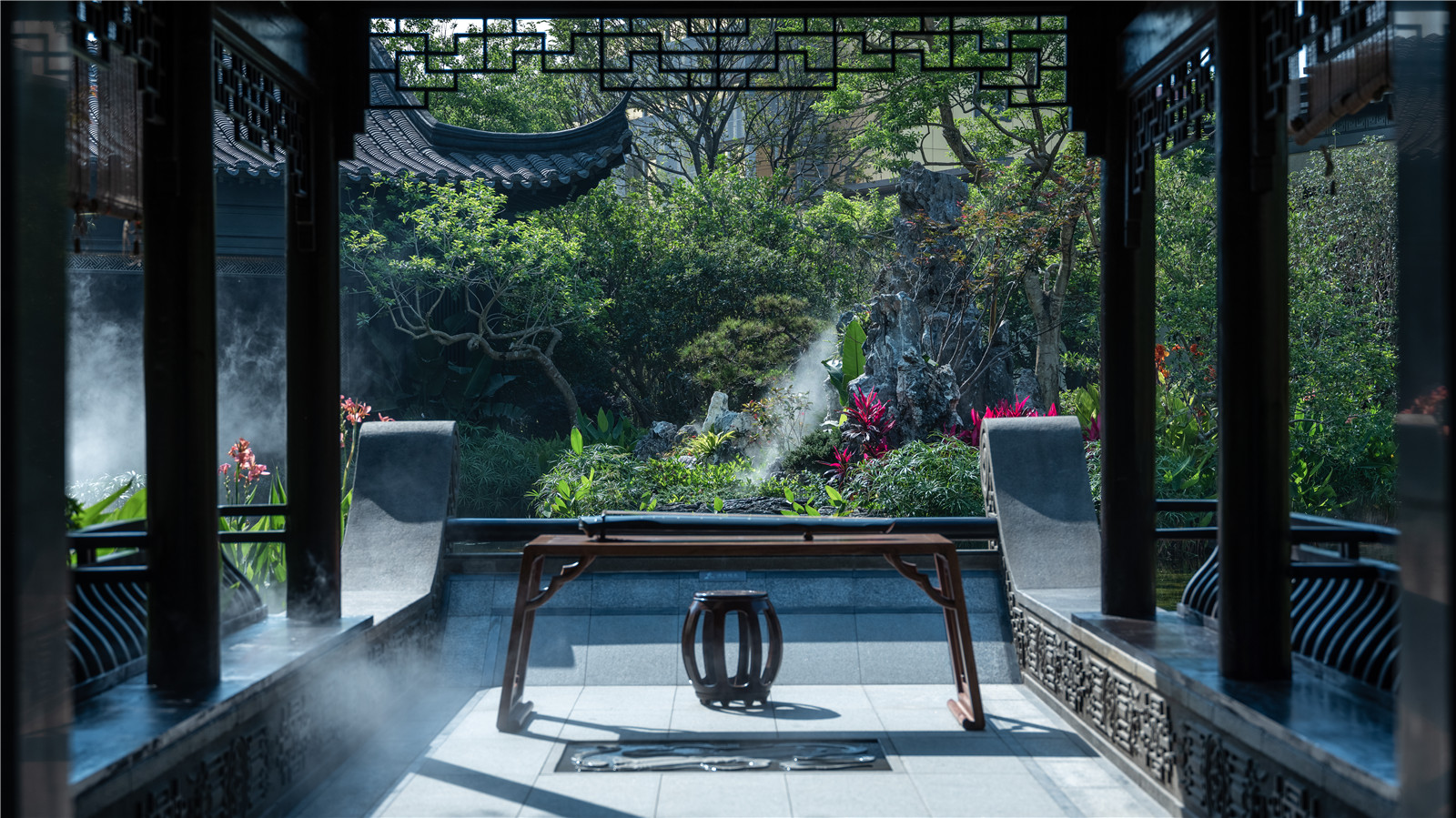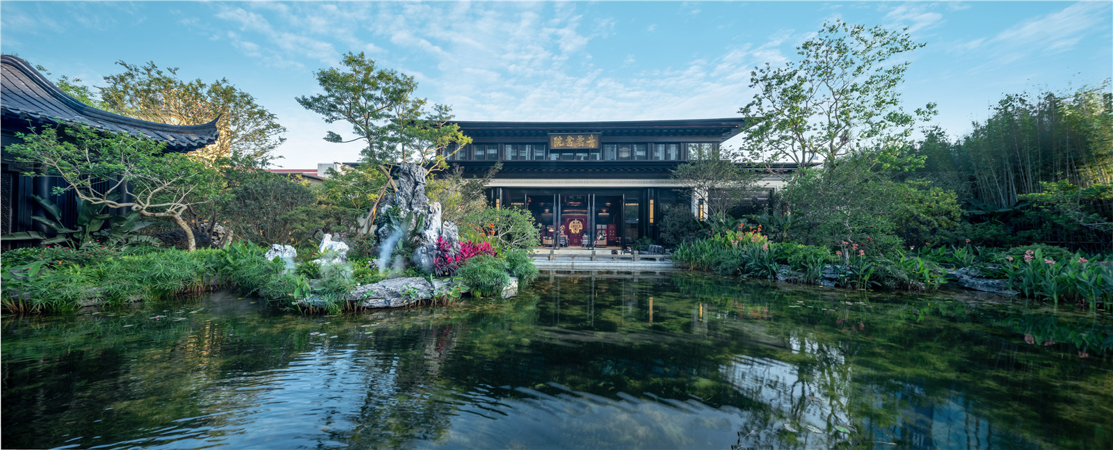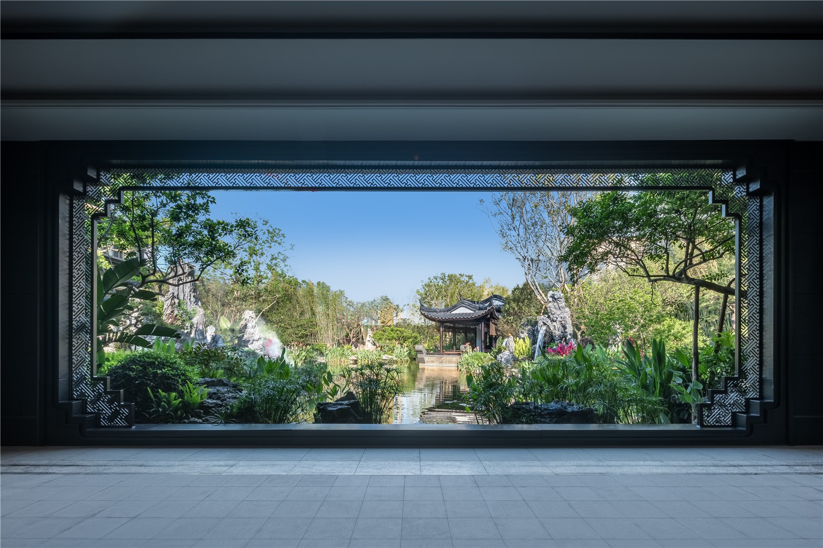 鳳凰齊飛,鳴如簫笙,音如鐘鼓。一進(jìn)院的雙鳳朝陽地雕暗合珠海鳳凰山,旨在把當(dāng)?shù)匚幕谌氡痉桨钢?,寓意吉祥和諧,登門大吉。入口門樓尊崇儒家禮制,門樓兩側(cè)的“水墨江山圖”下置石點(diǎn)綴其側(cè),再配以造型松、礫石、漣漪、青瓦,構(gòu)成一副立體的山水畫卷,呈現(xiàn)一個(gè)專屬的新中式美學(xué)作品。