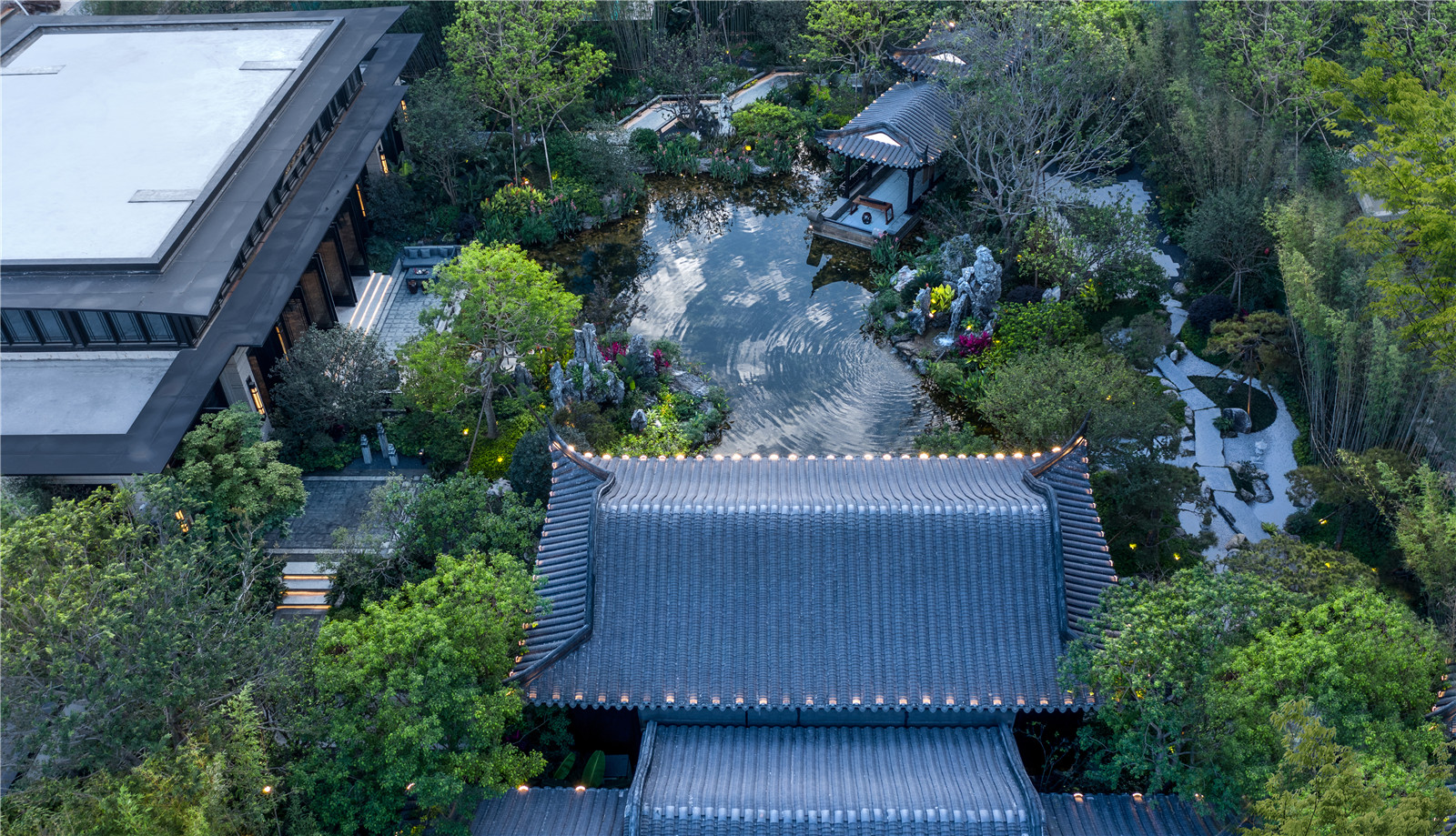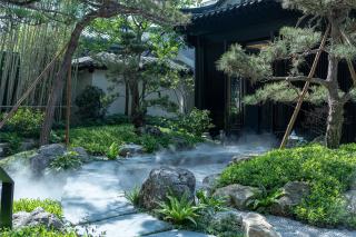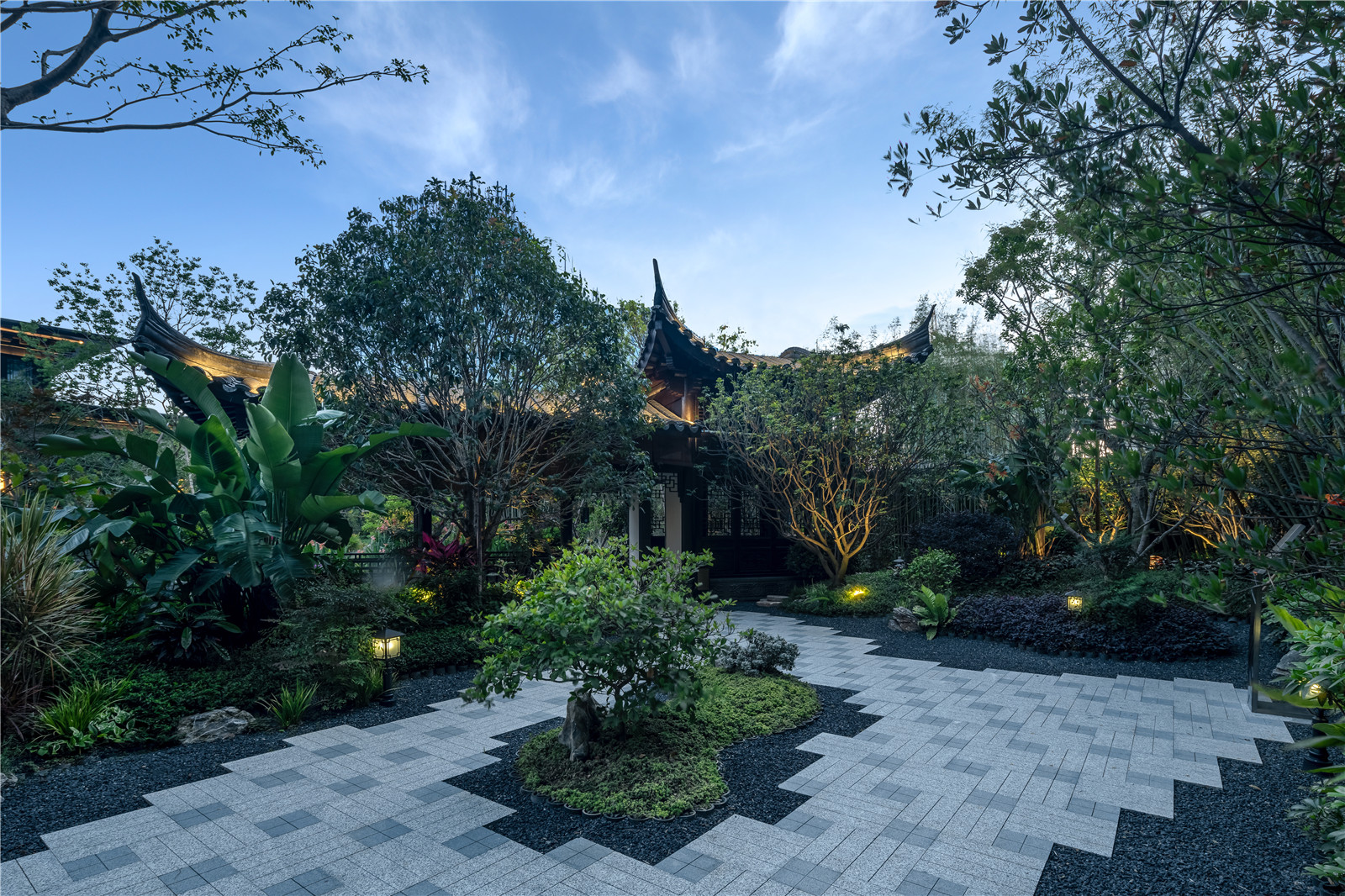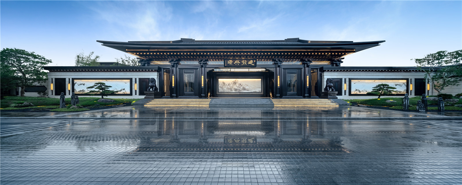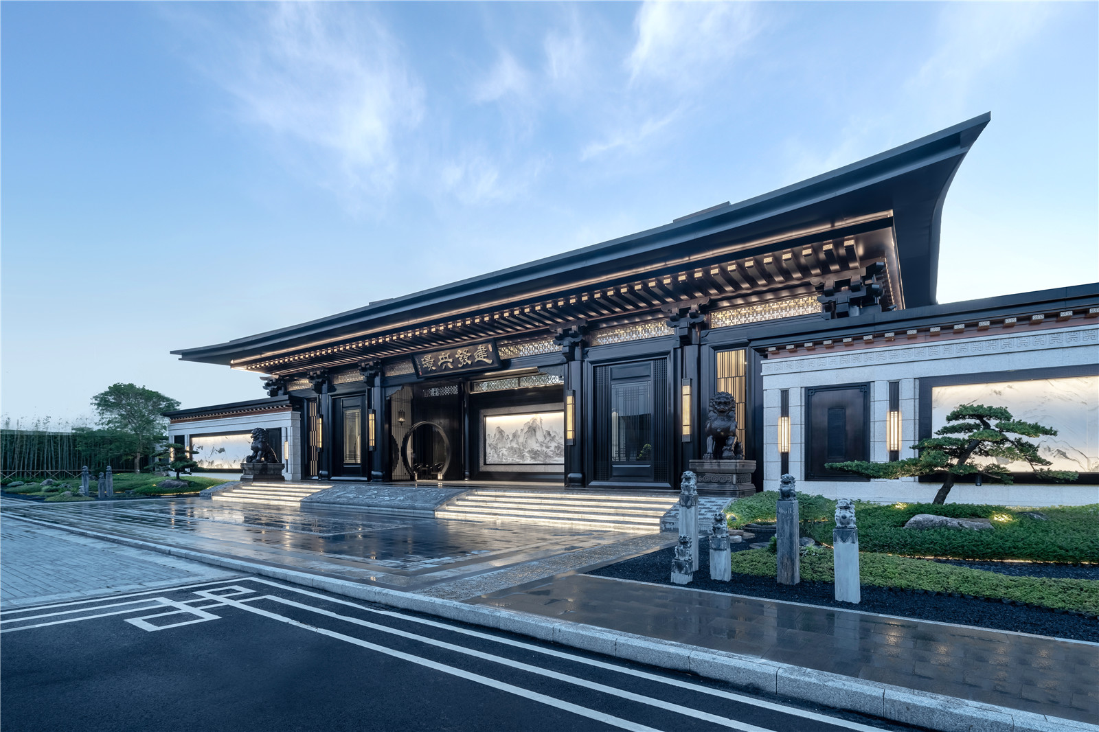 鳳凰齊飛,鳴如簫笙,音如鐘鼓。一進(jìn)院的雙鳳朝陽地雕暗合珠海鳳凰山,旨在把當(dāng)?shù)匚幕谌氡痉桨钢?,寓意吉祥和諧,登門大吉。入口門樓尊崇儒家禮制,門樓兩側(cè)的“水墨江山圖”下置石點(diǎn)綴其側(cè),再配以造型松、礫石、漣漪、青瓦,構(gòu)成一副立體的山水畫卷,呈現(xiàn)一個(gè)專屬的新中式美學(xué)作品。