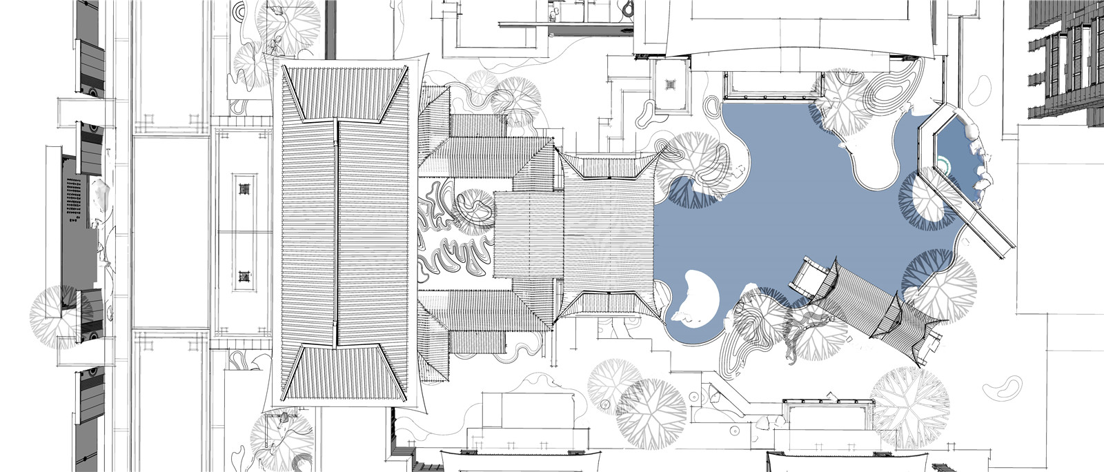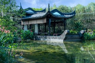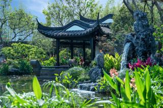 山水園空間雖小而山峰峻峭,瀕水有橋,遠(yuǎn)近成景。拾階而上便見采用中國傳統(tǒng)卷棚式歇山頂構(gòu)造方式的亦瀾亭,向南望去,一方清池盡收眼底,天地相輝成影,清池皓潔如鏡。微風(fēng)拂面,輕踏畫舫。煙波浩渺,青松婆娑,仿入仙境。池面開闊,三面可游,天地掩映,一池繁花,或臨水嬉戲或駐足觀景,好不自在。