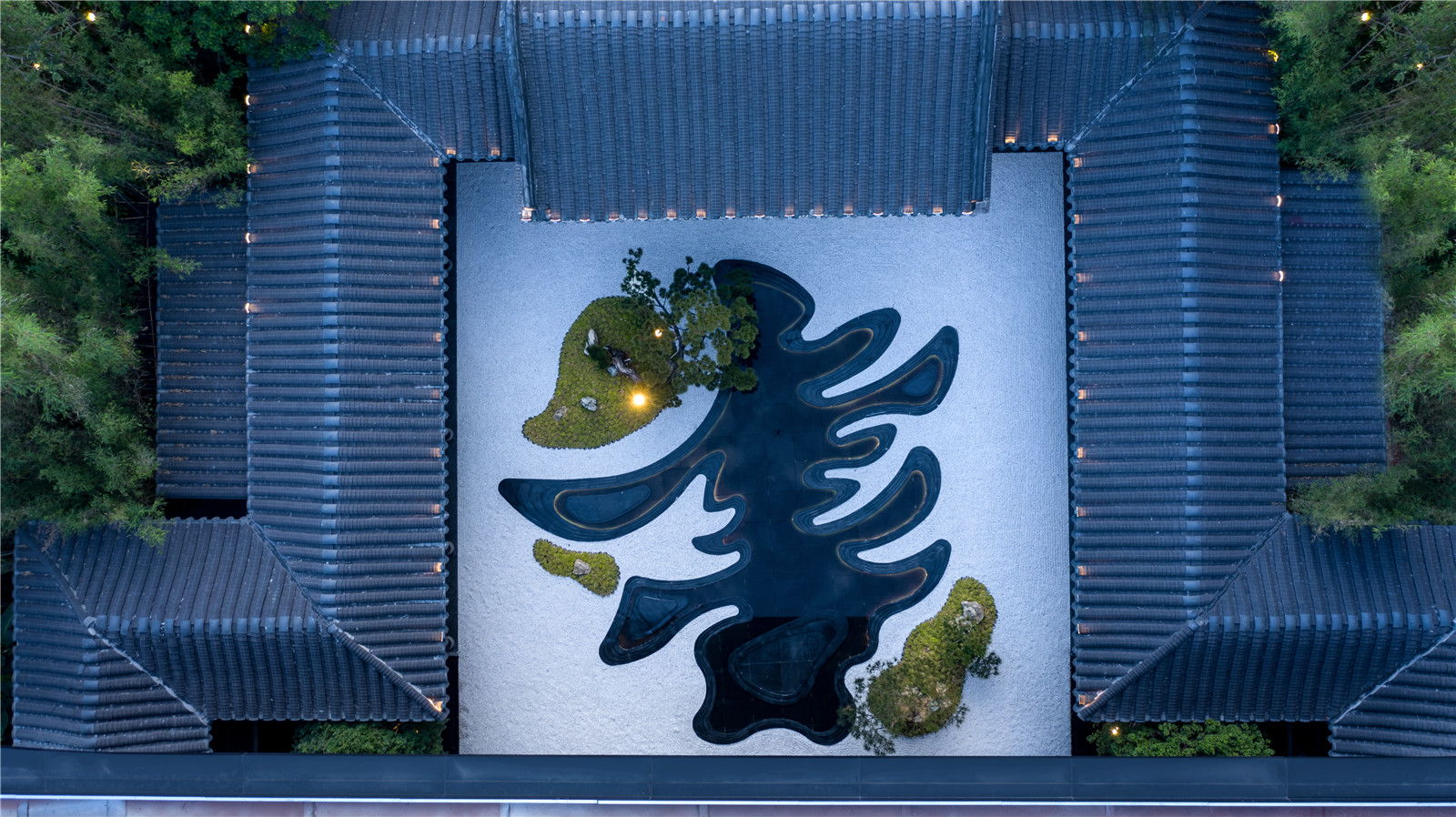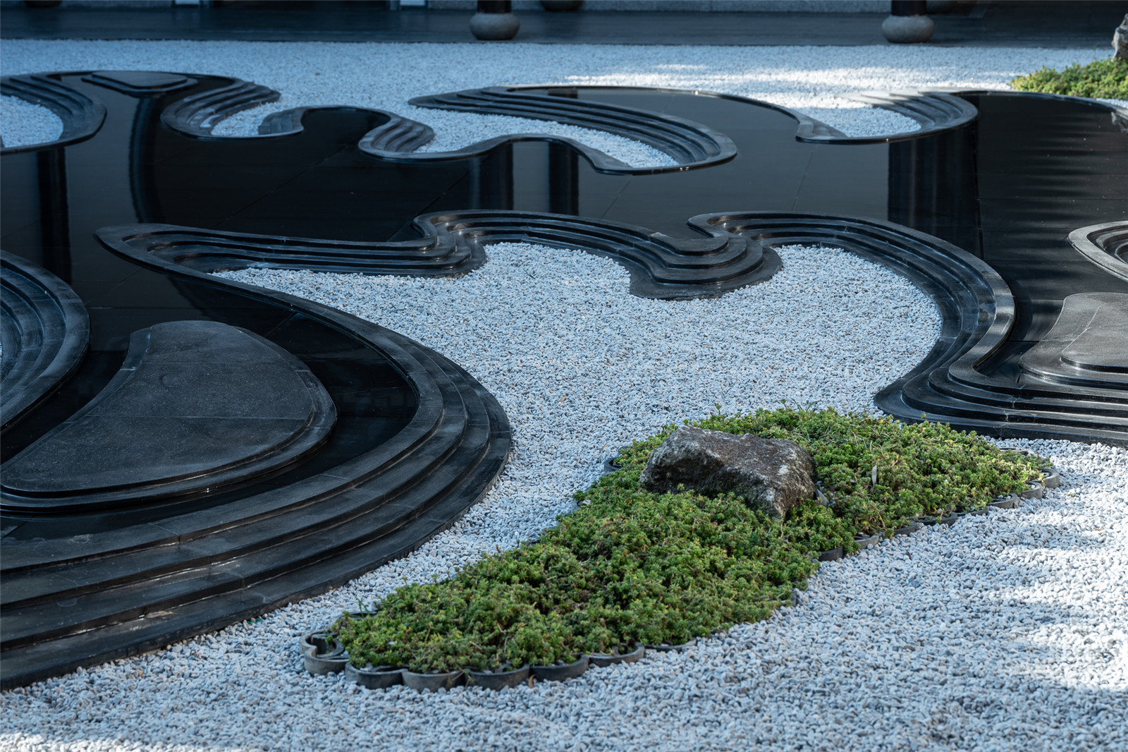 “墨,書墨也”。二進(jìn)院以書為題,展現(xiàn)一個(gè)浸潤著書香、充盈著智慧、彌漫著情懷的修煉場。一砂一極樂,一方一凈土,白色的礫石與黑色的“書”字交相輝映,空間的禪意枯寂、悠遠(yuǎn)綿長得以呈現(xiàn)。