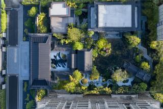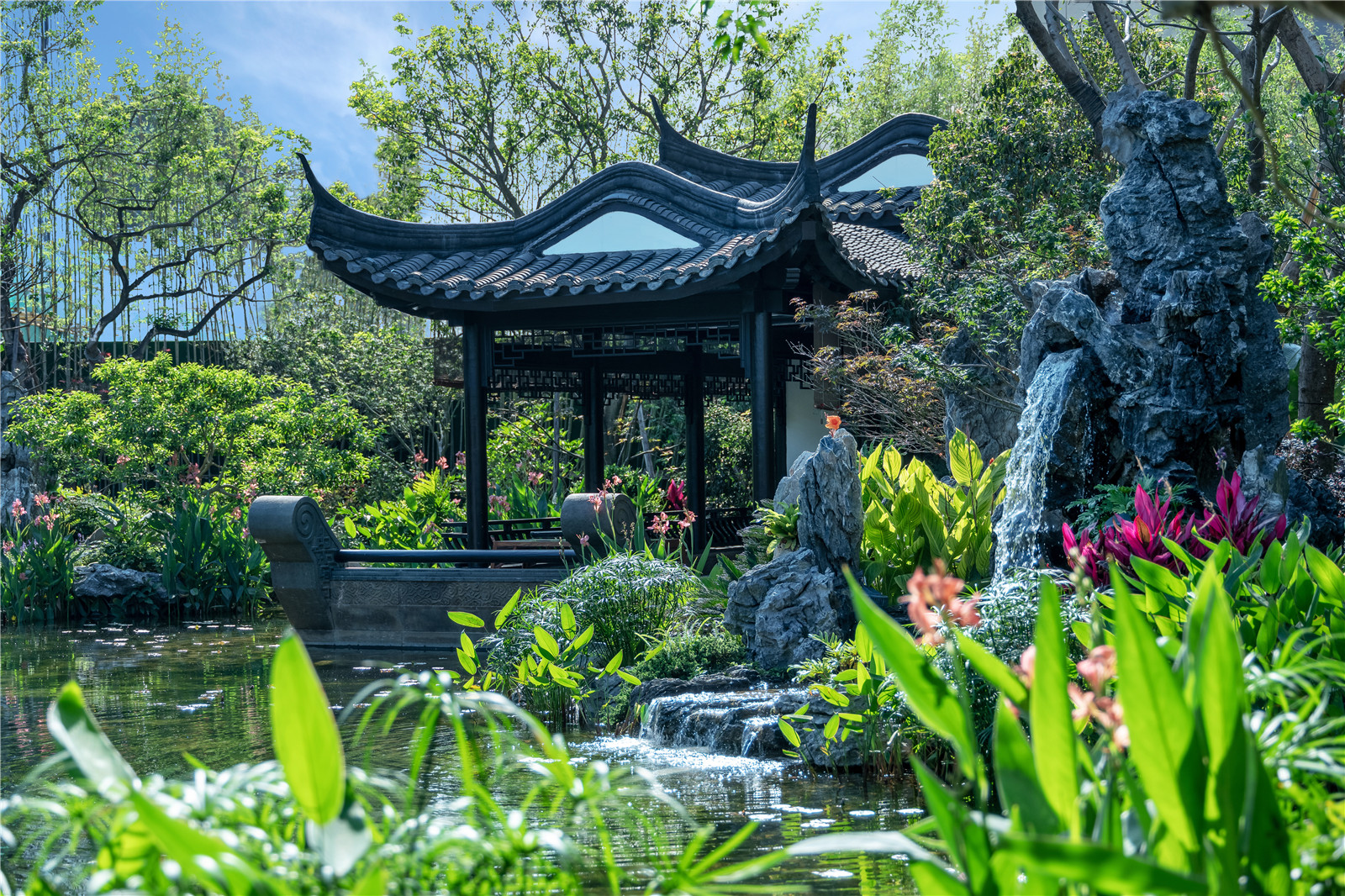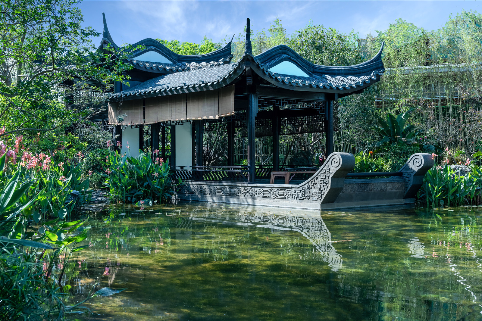 循徑而行,途中假山、綠植、水聲、鳥鳴,曲折變幻。飛檐翹角,粉墻花影,山與水于此和鳴,在曲折婉約之中,營造流水行云舒張自如的詩意,每一處都藏著玩味不盡的妙趣。