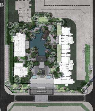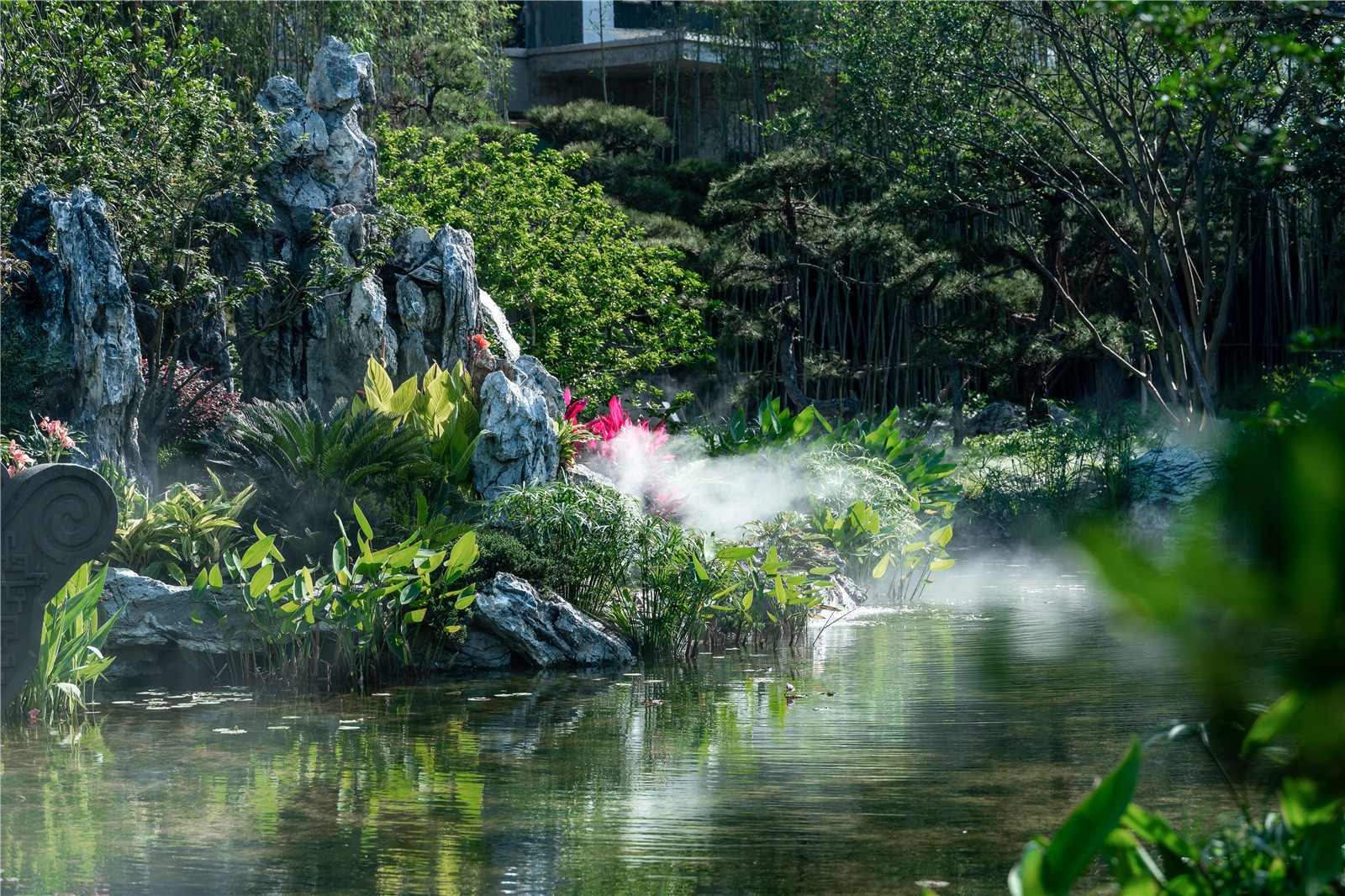 以山為勢(shì),借水流轉(zhuǎn),山水園的景觀構(gòu)建在山、水、屋交融并構(gòu)的韻律中情境悠遠(yuǎn)。設(shè)計(jì)通過打造自然山水,大面積水域通過生態(tài)過濾,自我凈化,形成獨(dú)立完整的微氣候環(huán)境。