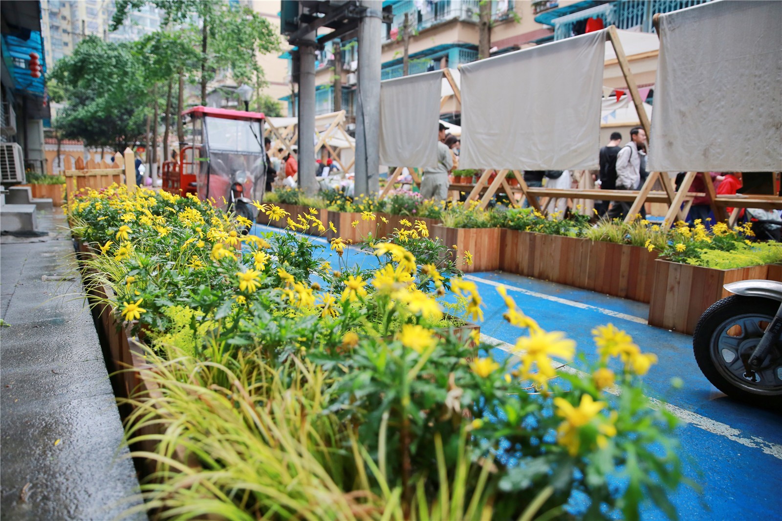 在對(duì)新北計(jì)劃推進(jìn)與觀察的同時(shí),工作室啟動(dòng)了另一個(gè)實(shí)驗(yàn)性項(xiàng)目—— “共享街道計(jì)劃”,第一個(gè)選點(diǎn)落在了高新區(qū)永豐家園,這也是2019年就申報(bào)立項(xiàng)的社區(qū)激勵(lì)資金項(xiàng)目,在2020年以前已經(jīng)完成了參與式設(shè)計(jì)的過程和社區(qū)開放日活動(dòng),但由于疫情的影響,真正開工滯后到了2020年底。3月14日永豐社區(qū)的居民迎來了共享街道建成后第一場(chǎng)主題市集,而對(duì)于元有,這也是首次將社區(qū)營造的過程從空間改造延展到持續(xù)運(yùn)營環(huán)節(jié),希望能從公益切入,建立居民參與的社區(qū)商業(yè)場(chǎng)景,并提升與周邊街區(qū)人群和文化的流動(dòng),最終形成能夠自循環(huán)的造血能力。