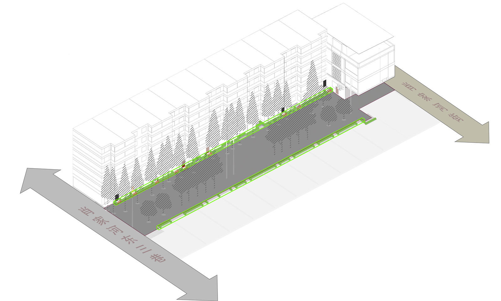 原有綠化帶不具備可進(jìn)入性,既占據(jù)了原本可以用于行走的空間,又滋生了一樓住戶私自開設(shè)后門、圈地種菜的違規(guī)行為。拆除這些消極綠地,讓整個(gè)街道處在同一個(gè)標(biāo)高平面,一方面可以釋放更多的公共空間還給街道,模糊車與人的界線,為共享空間打下基礎(chǔ);另一方面也能夠通過花箱、木門等設(shè)計(jì)手段明確公私邊界,既充分尊重了一層住戶的現(xiàn)狀和需求,也為將來街道的社區(qū)共享制定了規(guī)則。