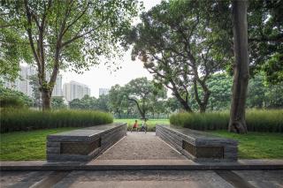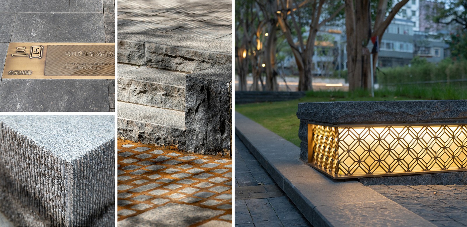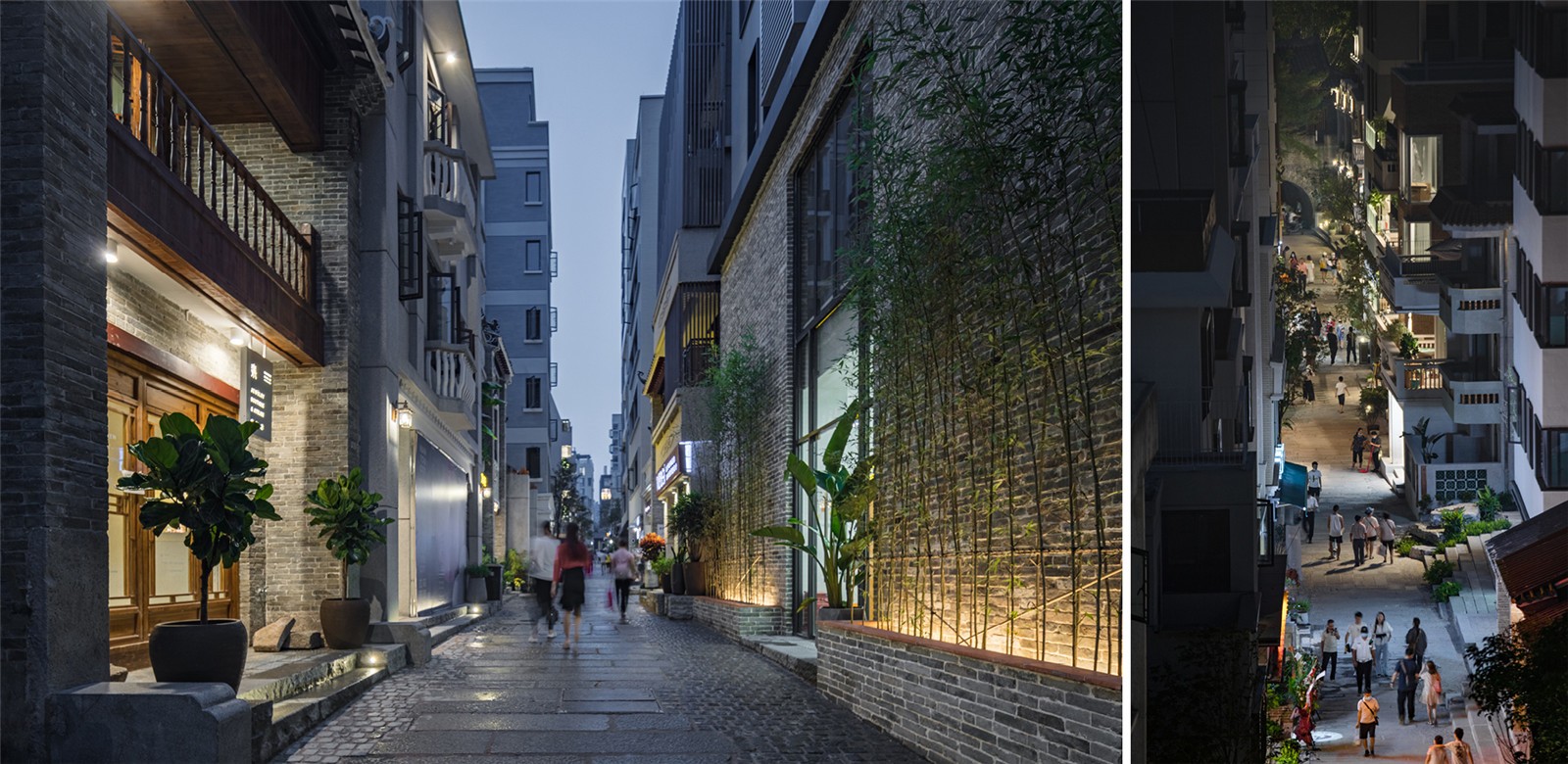 Based on local Ling-nan Cantonese architectural style,the main street and its lanes are mainly paved by recycled local stones aswell. Modern and historical materials and design elements are reasonablyapplied on this ancient site as if a dialogue on culture were being vividlyperformed through time and space.
