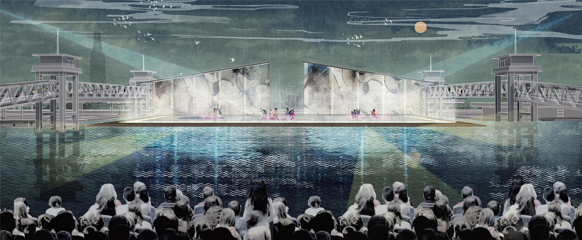 ▲從工業(yè)過渡到文化表達:原有的裝貨平臺和浮動平臺等基礎(chǔ)設(shè)施提供了前往水上舞臺的步行通道,人們可在此欣賞戶外藝術(shù)展覽和表演(上圖);公共座位區(qū)被設(shè)置于高水位以上的區(qū)域,即使在洪水期, 仍然可以進行戶外表演,從而增進公眾對河流動態(tài)的了解(下圖)。? Sasaki