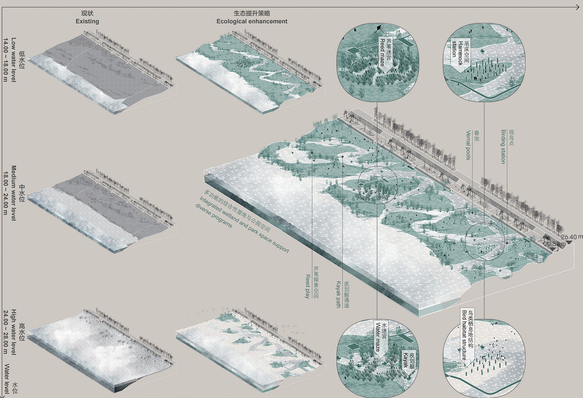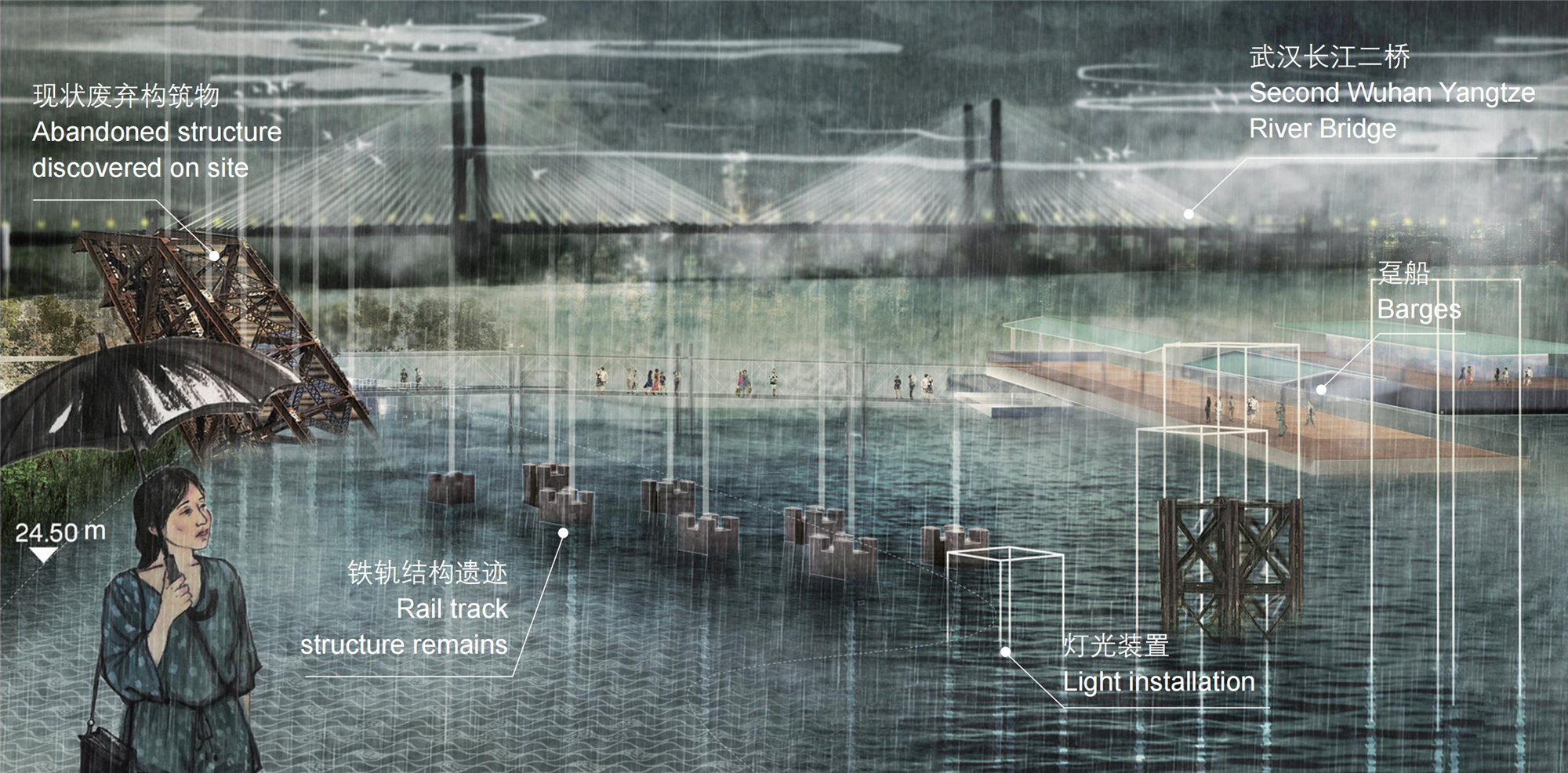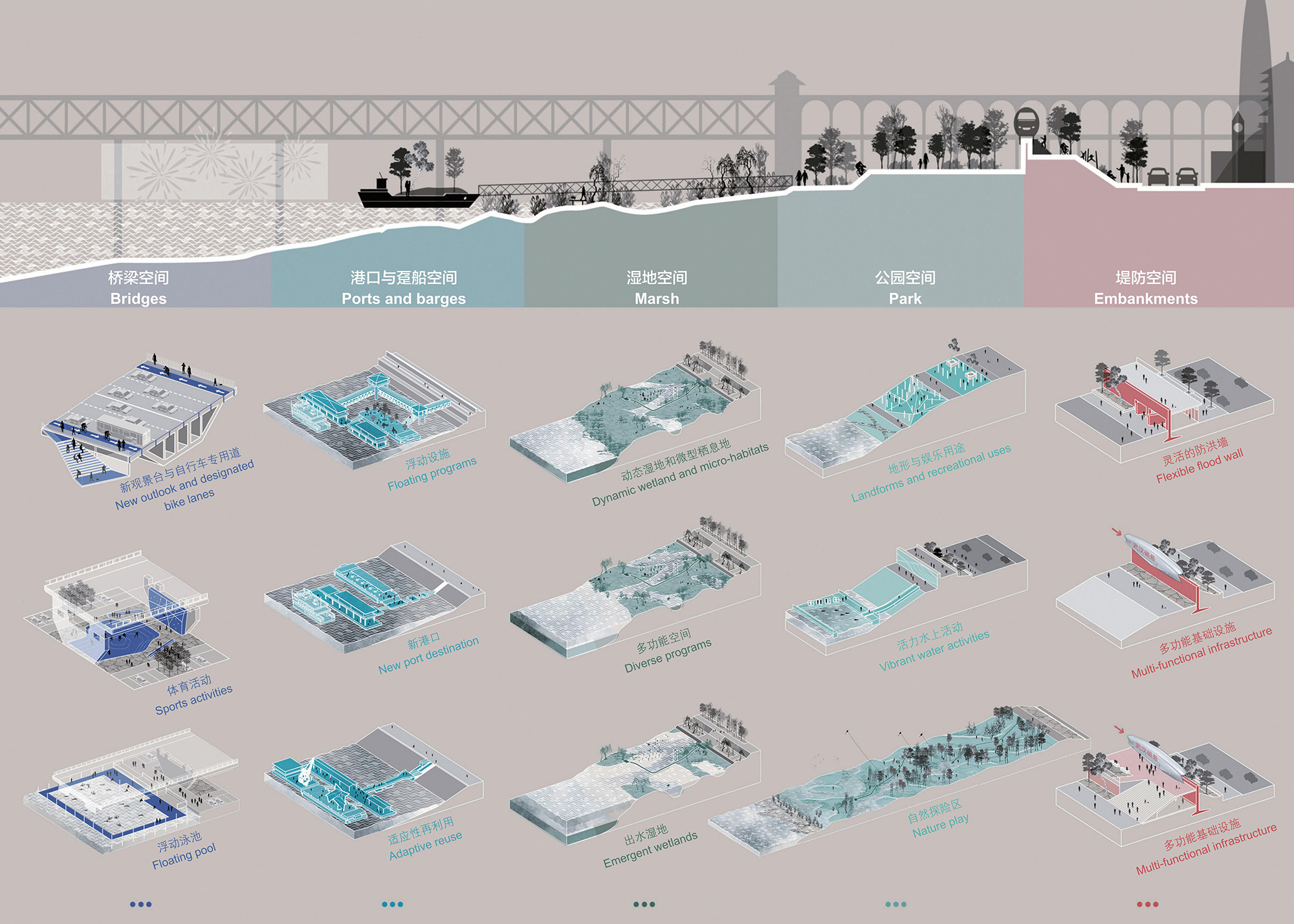 考慮到季節(jié)性洪水是長江自然水文過程的一部分,公園的規(guī)劃順應(yīng)了江水的季節(jié)性漲落。此時的公園結(jié)合濱江建筑、街道、堤岸、港口與橋梁及河岸線,提供了多層次的空間體驗。