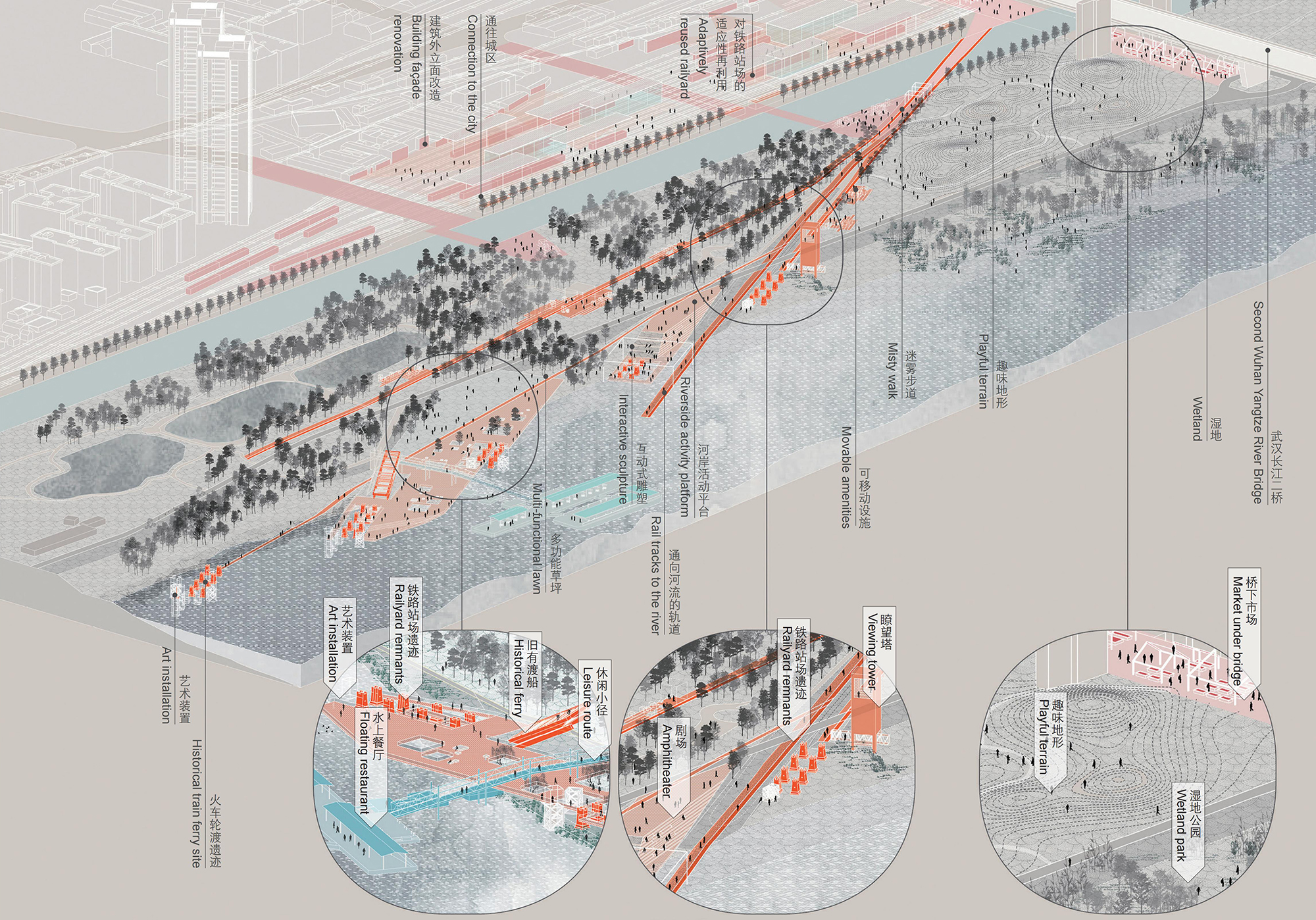 武漢現(xiàn)有的濱水空間多數(shù)為工業(yè)遺跡,空間體驗較差。在過去,城市主要沿著長江兩岸線性擴張,缺乏能夠?qū)⑷藗円龑?dǎo)至江邊的街道??梢姡瑸I水區(qū)缺少一個宏觀的景觀框架來凸顯長江的重要性,同時創(chuàng)造可供人們來江邊休憩的開放空間。濱水公園內(nèi)部標(biāo)志性碼頭和躉船均被保留了下來。除了一些仍被用作“浮動式社區(qū)花園”的躉船外 ,濱水公園的很多區(qū)域都已廢棄,但其中多樣的工業(yè)遺跡仍呈現(xiàn)出強烈的視覺沖擊力和開發(fā)潛力。