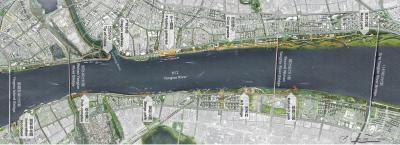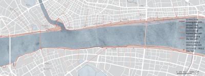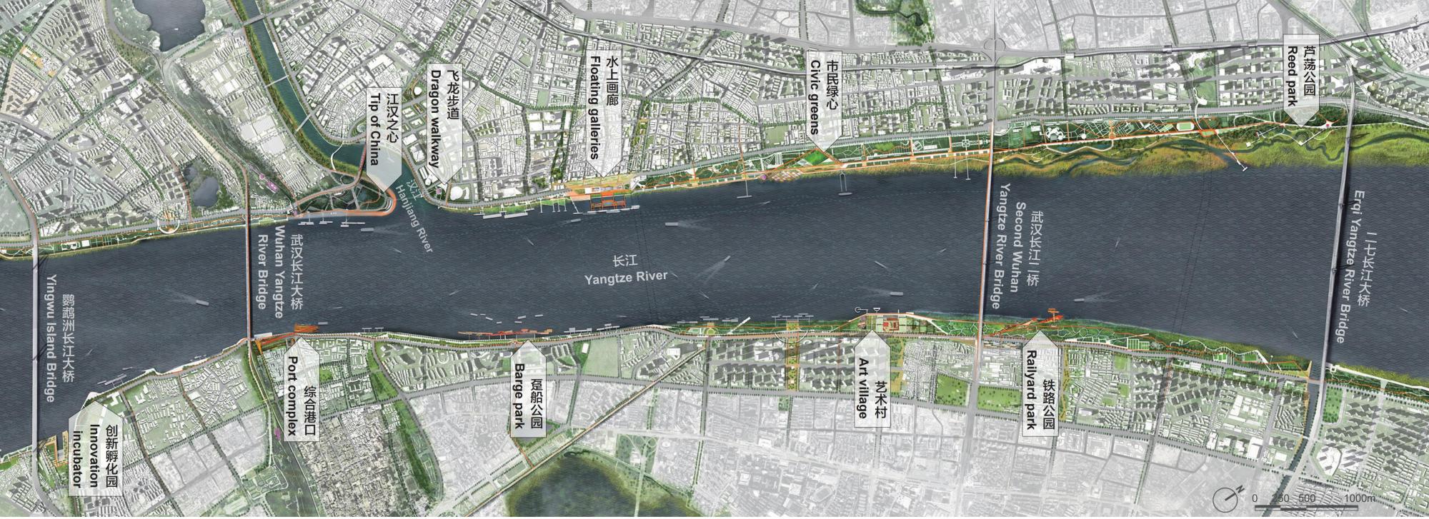 ▲總體規(guī)劃平面圖:擴建的濱水公園跨越了長江兩岸,為武漢打造出未來的景觀愿景——這里將形成一個連續(xù)的公共濱水帶。? Sasaki