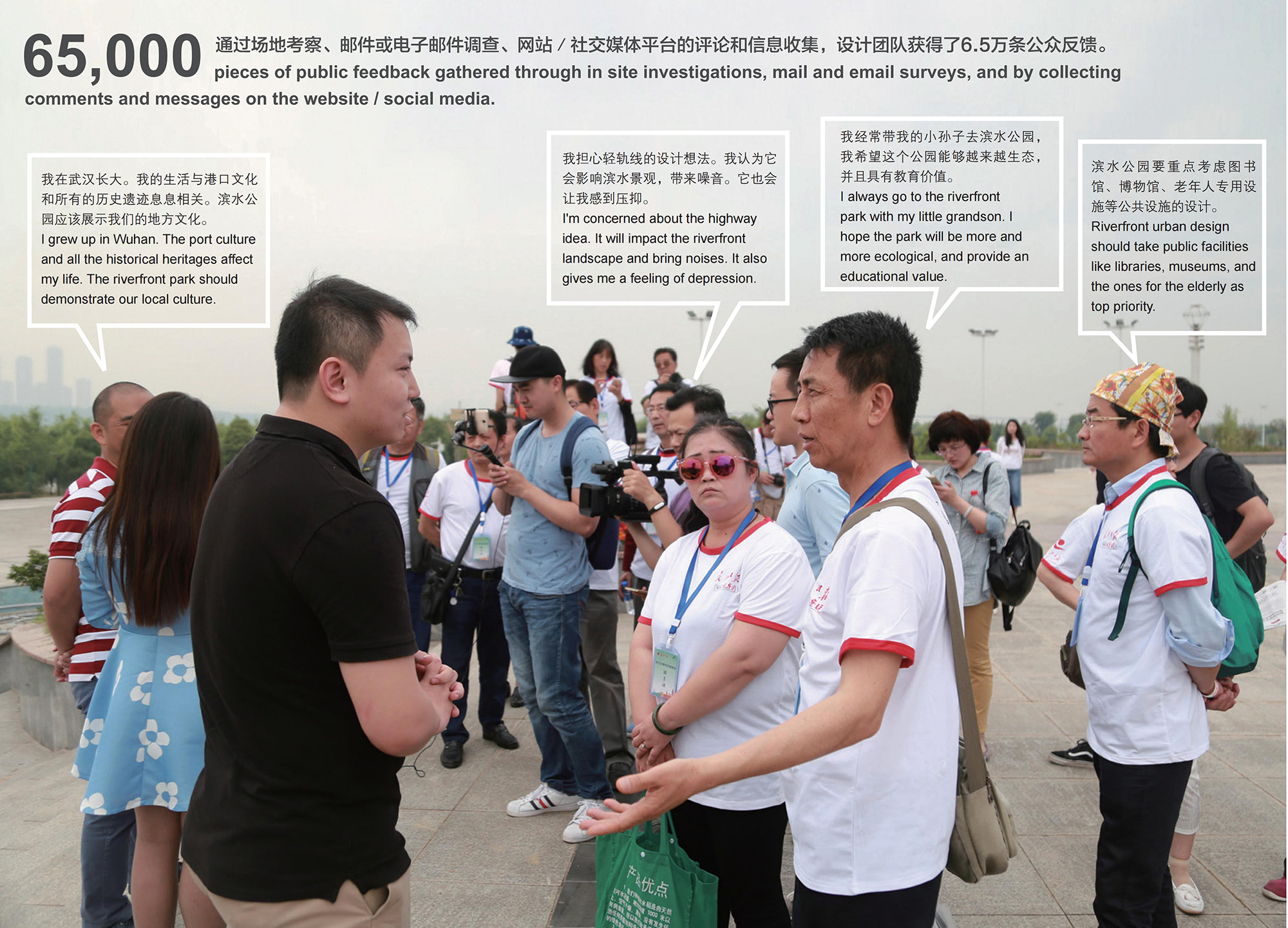 設(shè)計團隊利用社交媒體來進行最大限度的外展服務(wù)。在開展更多傳統(tǒng)公眾參與活動的基礎(chǔ)上,項目采用了眾源數(shù)據(jù)和信息收集模式。設(shè)計團隊收集到了來自武漢各地超過65000條的反饋意見,這些規(guī)劃意見直接影響了設(shè)計的迭代。與此同時,專門設(shè)計的項目網(wǎng)站能夠讓公眾了解公園的設(shè)計進展,同時征集市民、學(xué)者和設(shè)計同行等各利益相關(guān)群體的意見反饋。