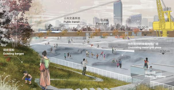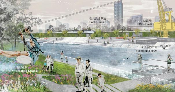 ▲與洪水共生的靈活空間:一系列躉船串連成了一條植被繁茂的水上長廊,可隨江水波動上下起伏。江岸與長廊間形成了一個可被淹沒的廣場,每逢洪水季節(jié),廣場上地形起伏的金屬網(wǎng)格柵會被淹沒,轉(zhuǎn)變?yōu)槠⌒u,供野生生物休憩。? Sasaki