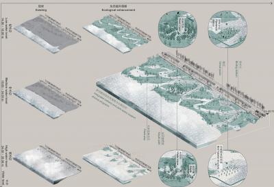 生態(tài)干預(yù)策略也為濱水區(qū)增加了可觀的價值。層級鮮明且更具生物多樣性的景觀設(shè)計改變了濱水區(qū)的價值形態(tài)。原本的灘涂轉(zhuǎn)變?yōu)槟軌蛟⒔逃跇返膱鏊?。基于對?dāng)前大面積同質(zhì)景觀的反思,設(shè)計團隊提出了多樣化的種植策略以增加物種豐富性。一系列的次級通道和起伏的地形創(chuàng)造了不同的微氣候,促進了具有鮮明季節(jié)特色的多樣化動態(tài)生態(tài)系統(tǒng)的自然演變。