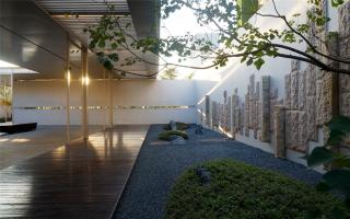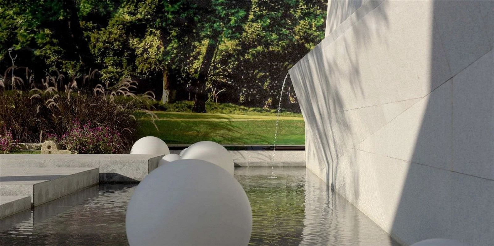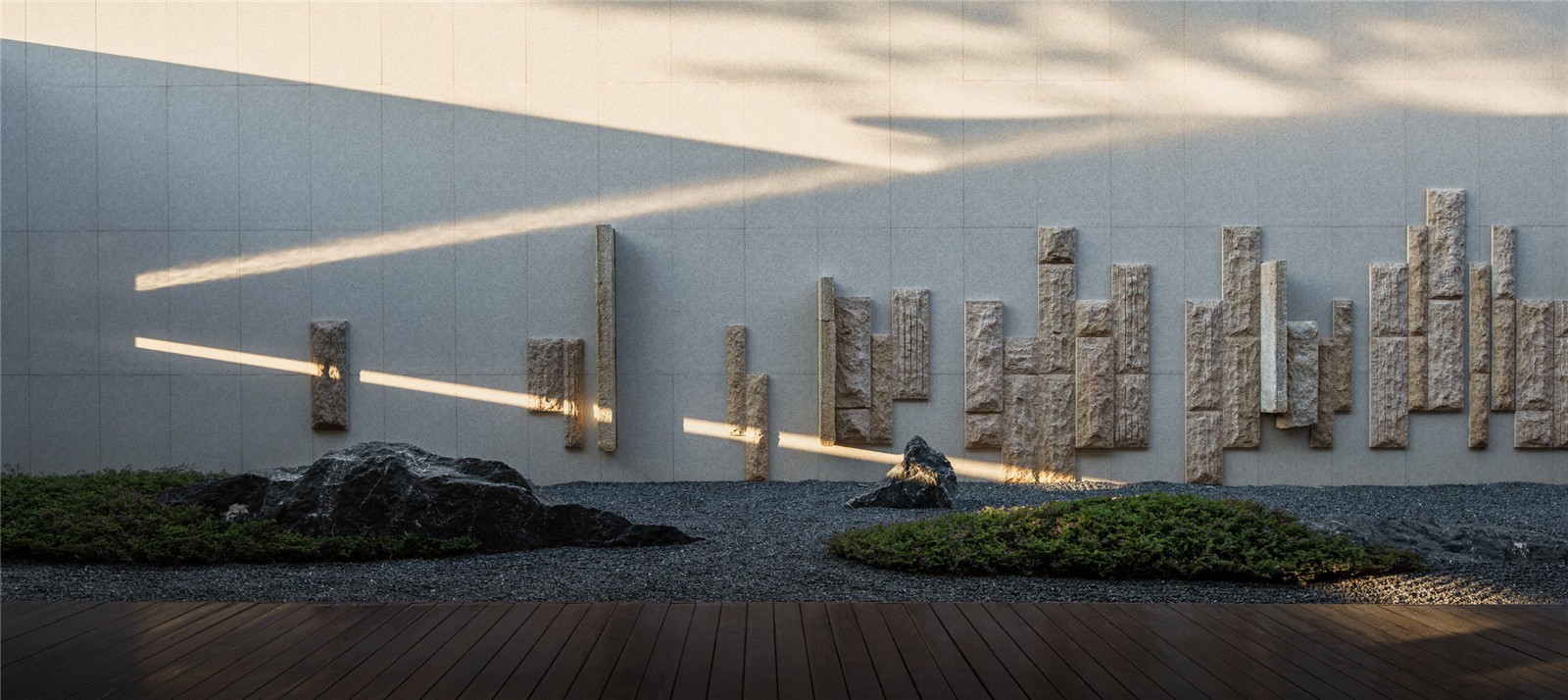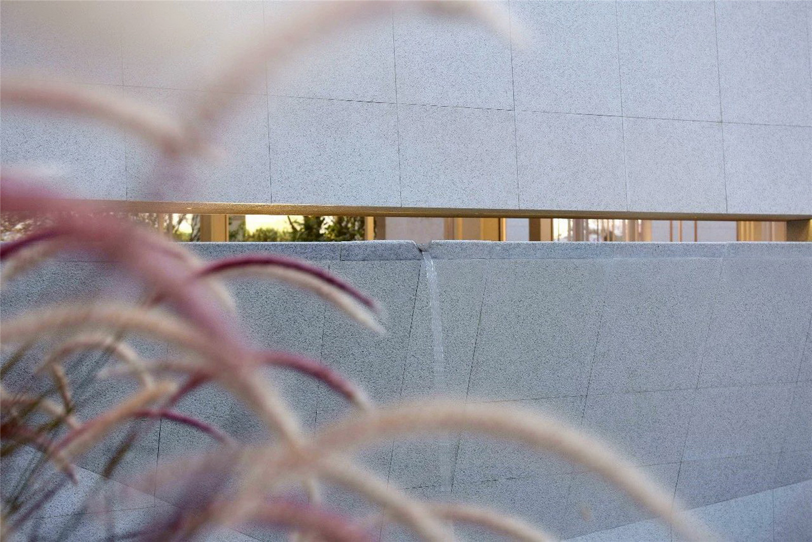 汀步右側(cè)是折面造型墻,開縫的位置設(shè)計(jì)了水景,一點(diǎn)點(diǎn)細(xì)水長流,既活躍了整體氣氛又保持該有的溫和情緒??臻g體現(xiàn)極簡設(shè)計(jì),通過水景的靈動,讓整個(gè)空間有了新變化,正是這一點(diǎn)點(diǎn)突破, 塑造了極簡的高級感。