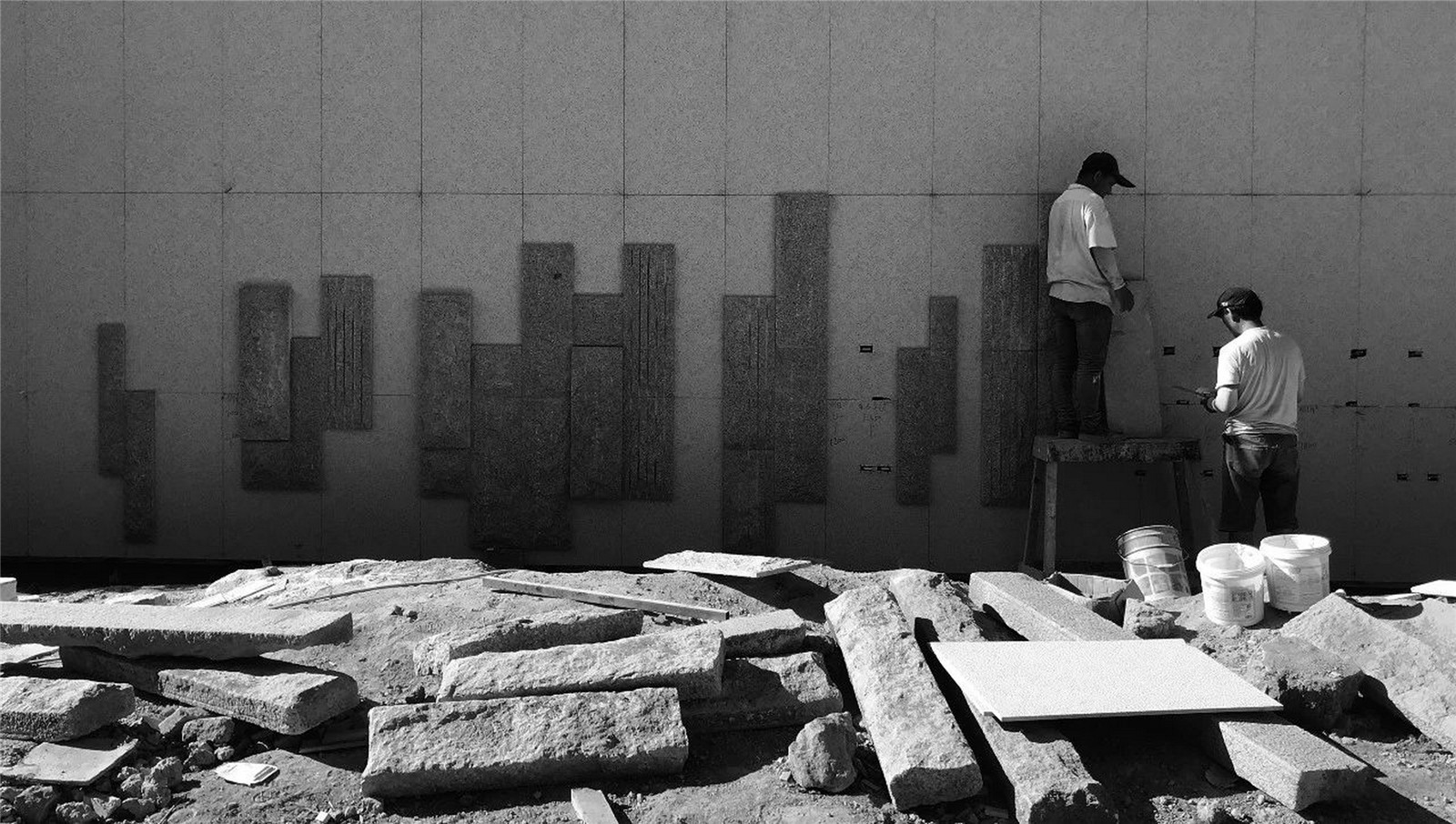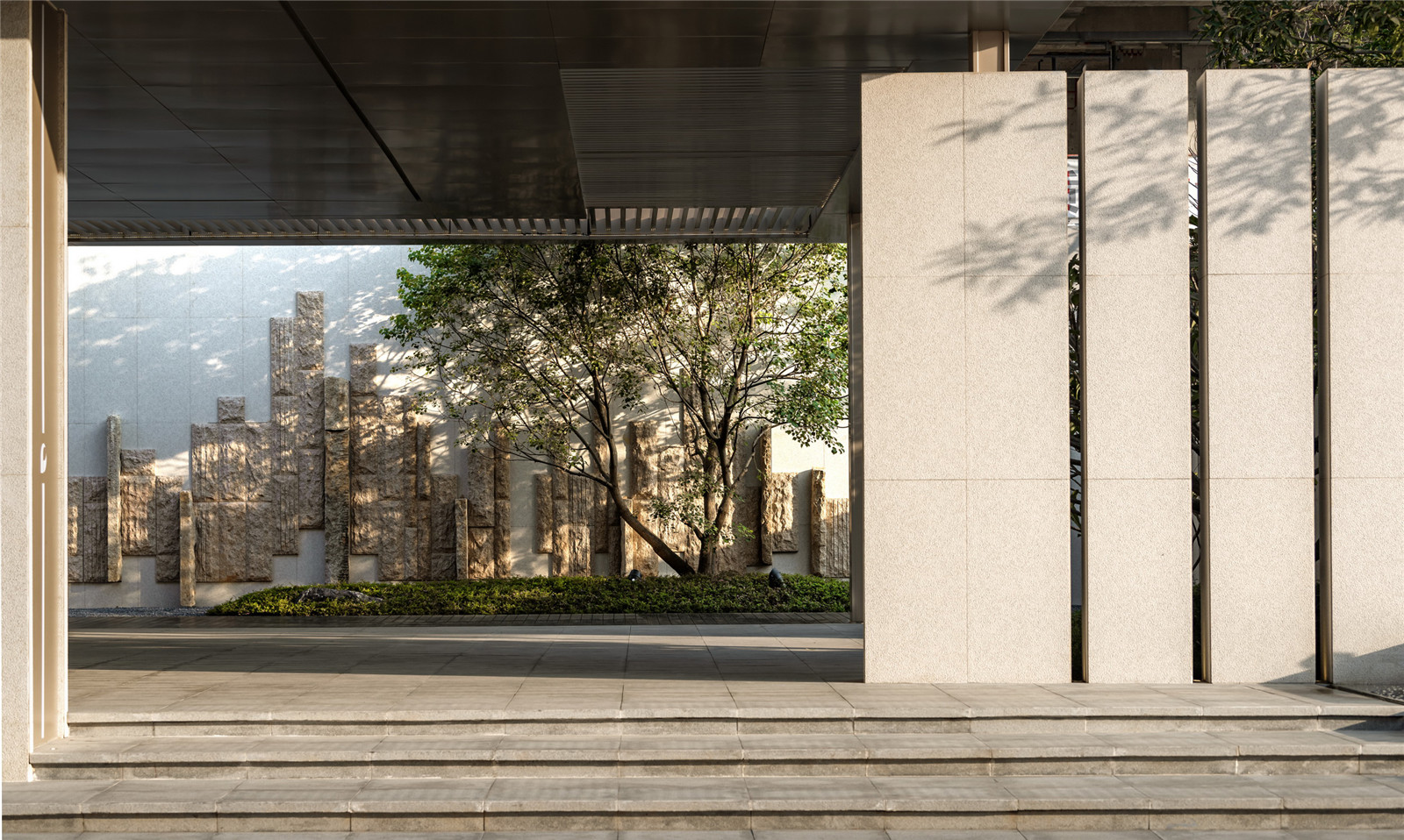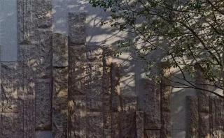 首先映入眼簾的是一個(gè)20多米長的迎賓景墻,通過保留五聯(lián)村房子拆遷下來的舊條石,運(yùn)用“體塊”和“線條”的空間元素加以切割、擠壓的方式強(qiáng)調(diào)空間的立體和縱深。
