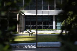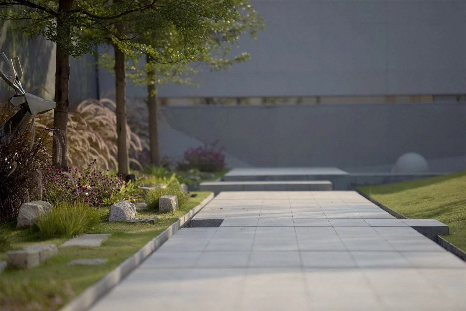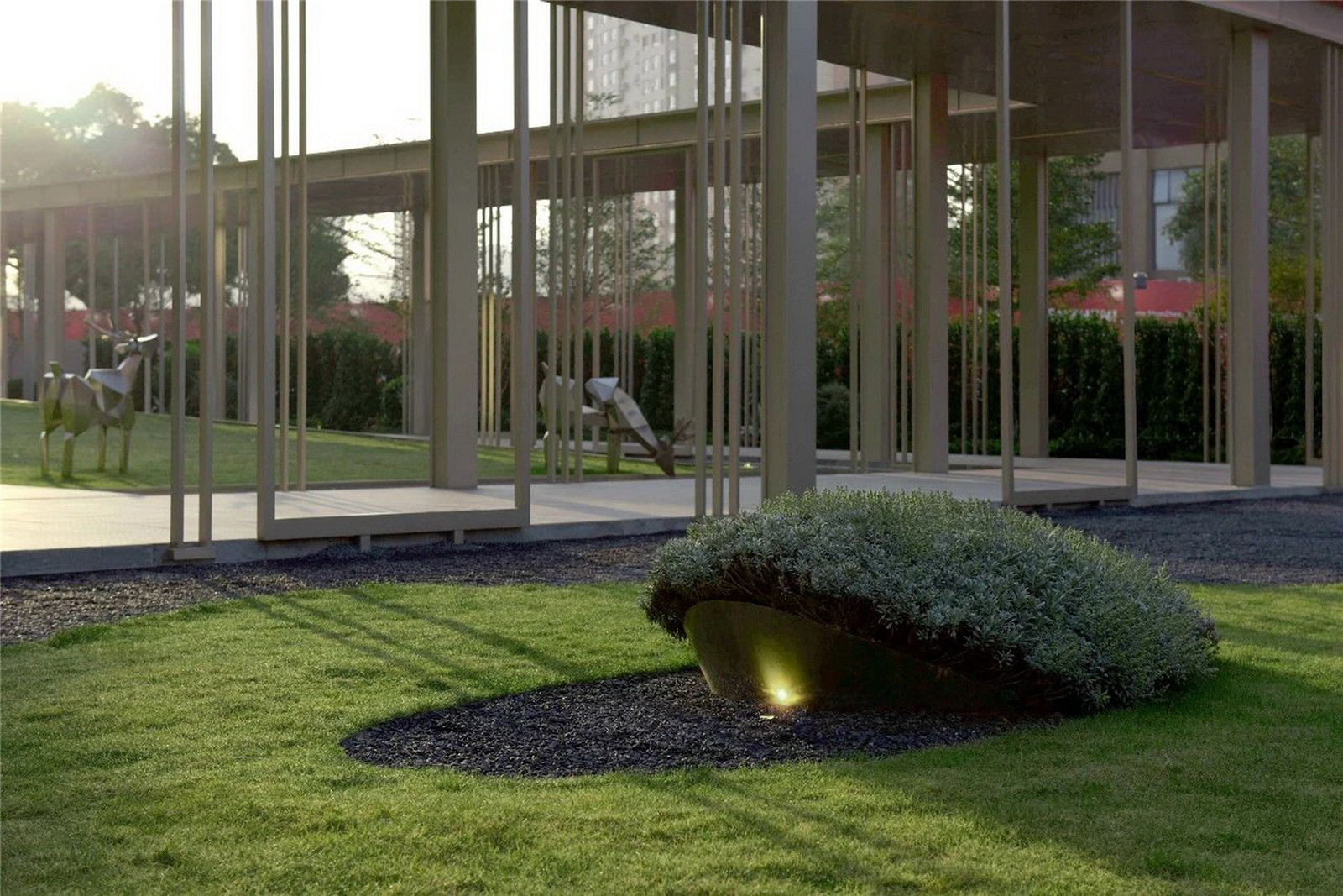 三個(gè)藝術(shù)小山丘搭配綠植花境,創(chuàng)造出極具張力的立體空間,斜面的設(shè)計(jì)與中庭水景、草坪坡地相呼應(yīng)。開闊的綠植端景,也讓建筑與周邊的自然和諧共生,呈現(xiàn)出清閑舒適的景觀雅境。