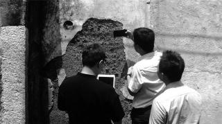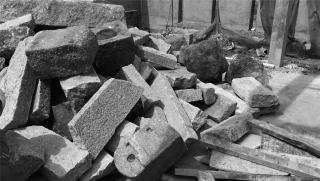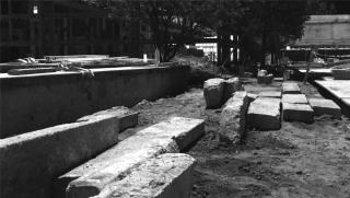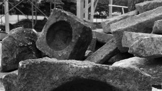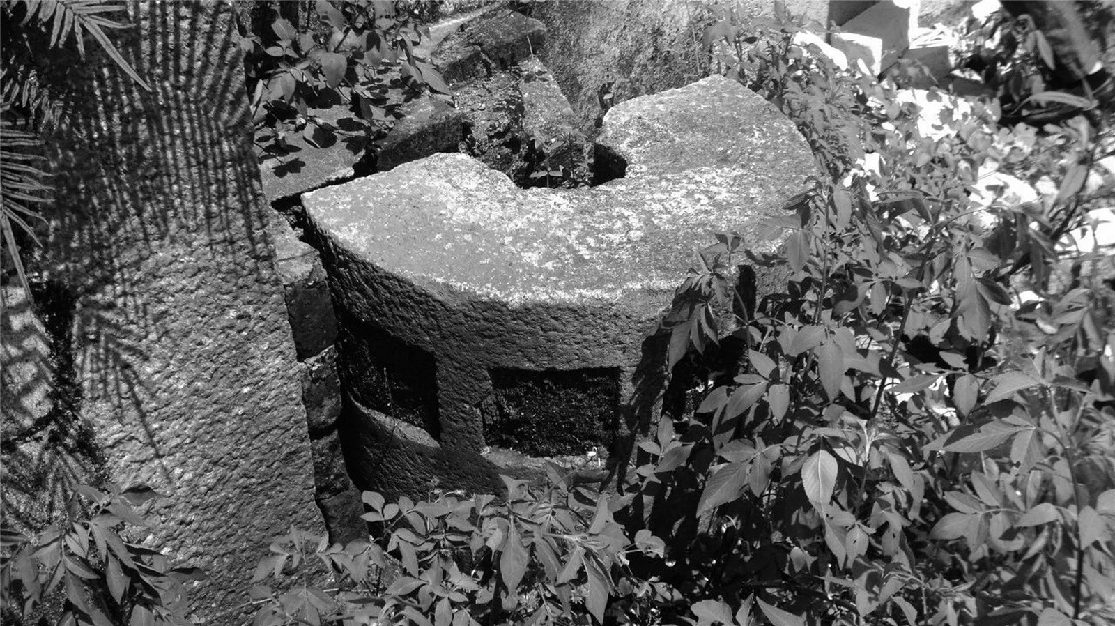 ▲項(xiàng)客家民居庭院留存下的舊條石與圓槽石