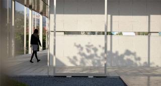 天氣晴朗的日子,陽光可以透過頂棚的格柵散落下來,隨著時(shí)間的推移,光影在石材地面上、木平臺上、礫石草坡上、墻面上留下變幻的痕跡,藏納了許多關(guān)于時(shí)光的記憶。