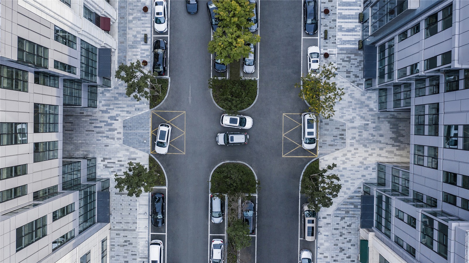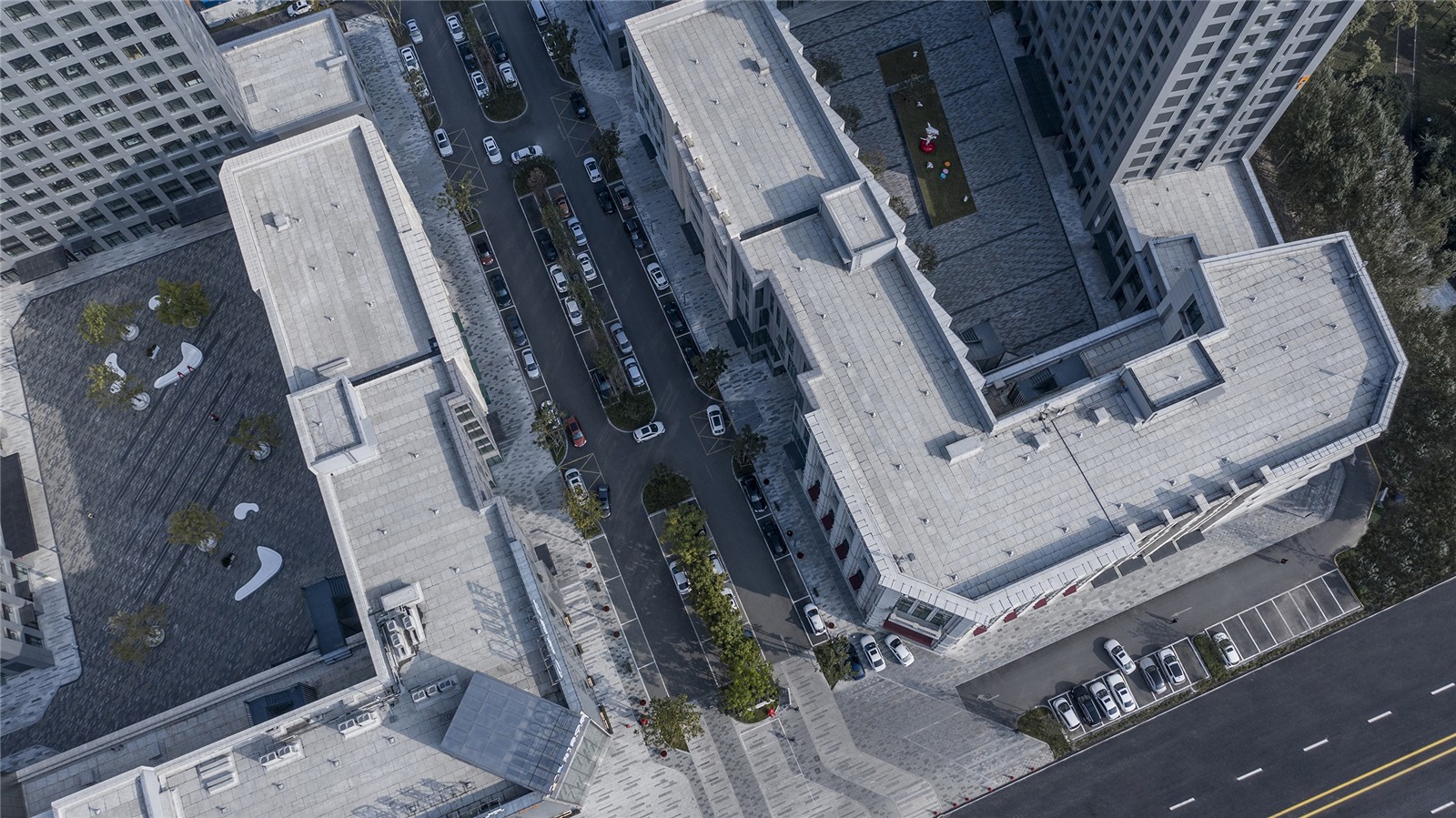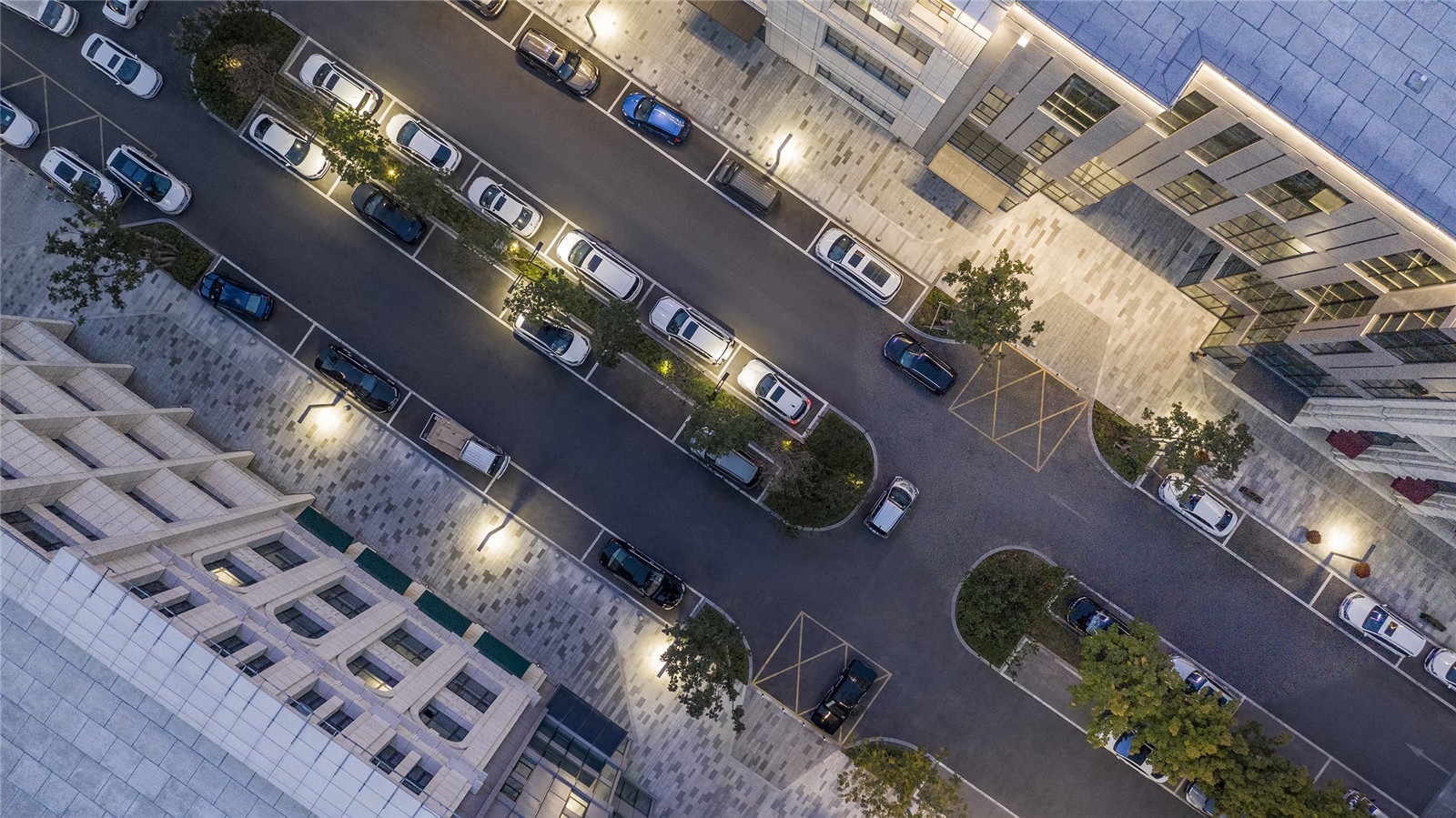 錯(cuò)落有致的露天停車位,植物、燈光、線條的設(shè)計(jì)賦予了美感。巧妙利用車位劃分雙向車流,凸顯井然有序之感。減少中層種植,使停車區(qū)的視線相對(duì)通透;上層喬木選用了冠形規(guī)整的遮陰喬木,增加停車區(qū)夏季遮陰面積,避免暴曬。