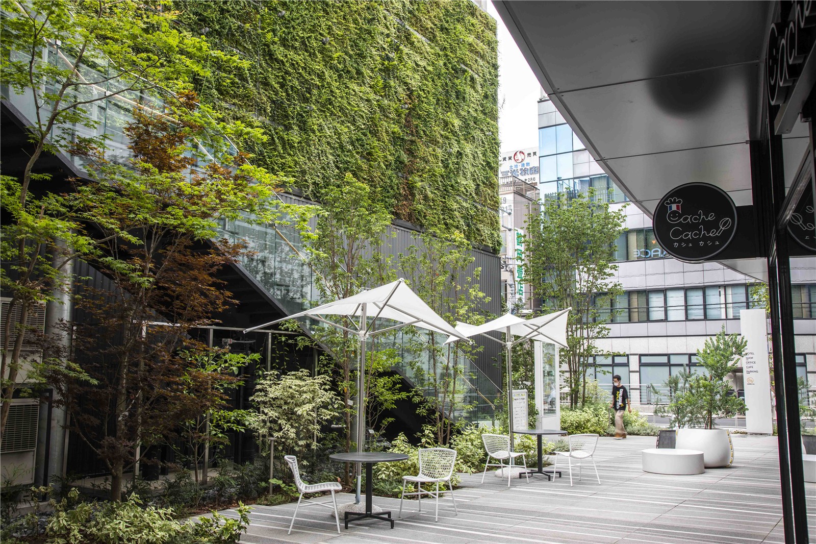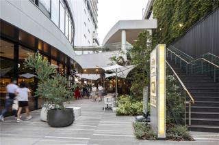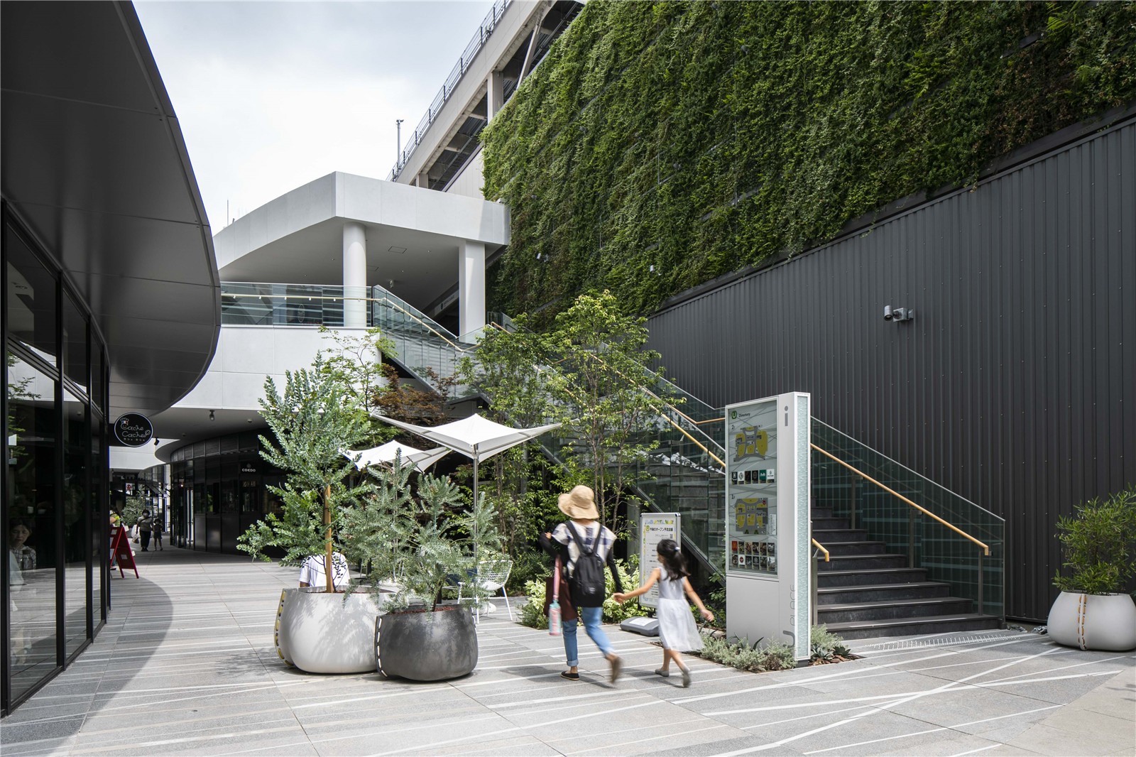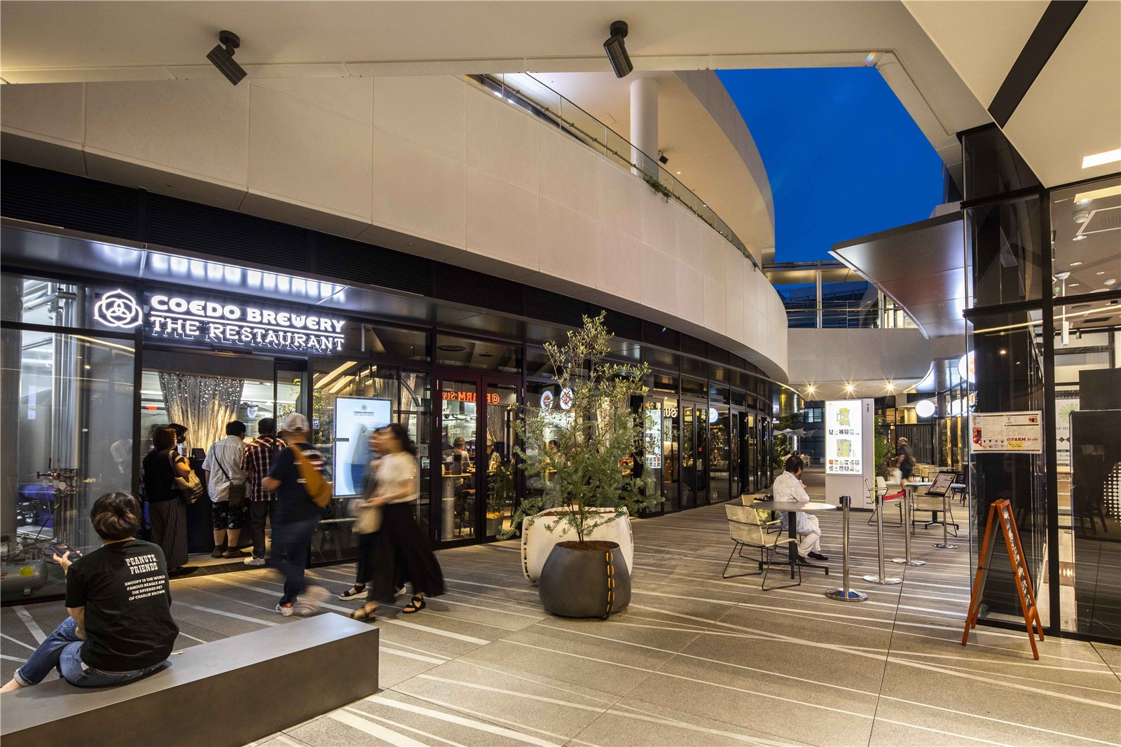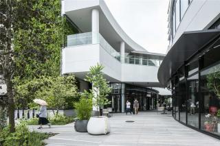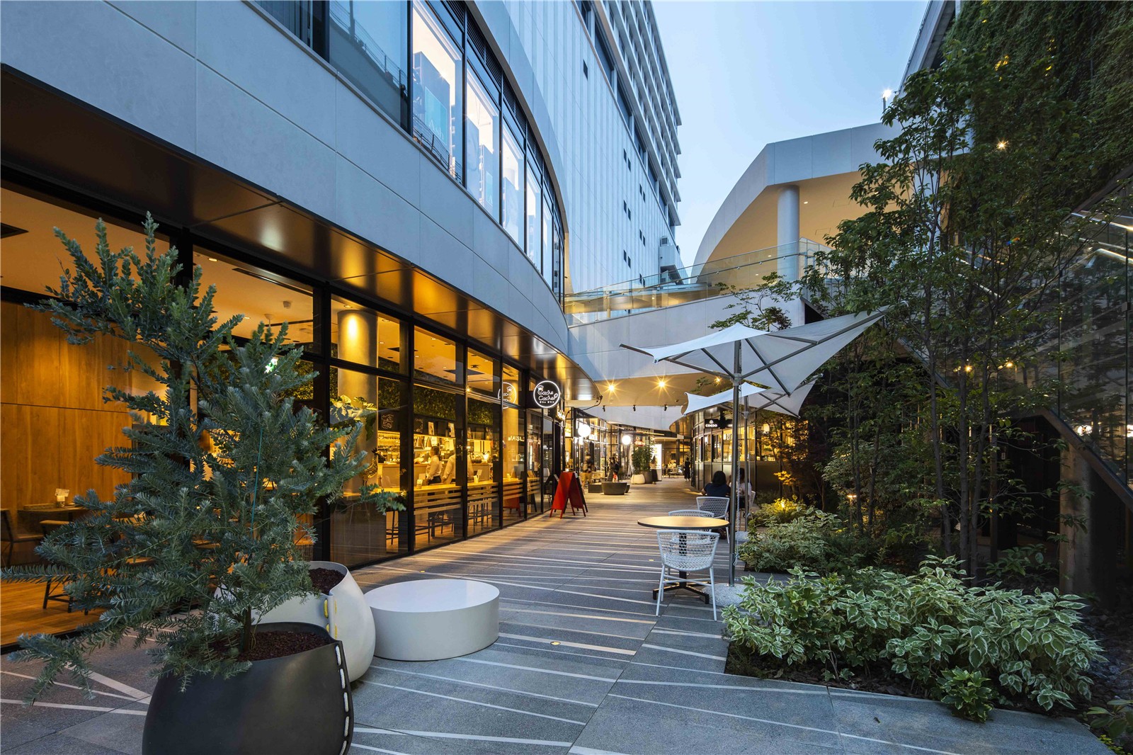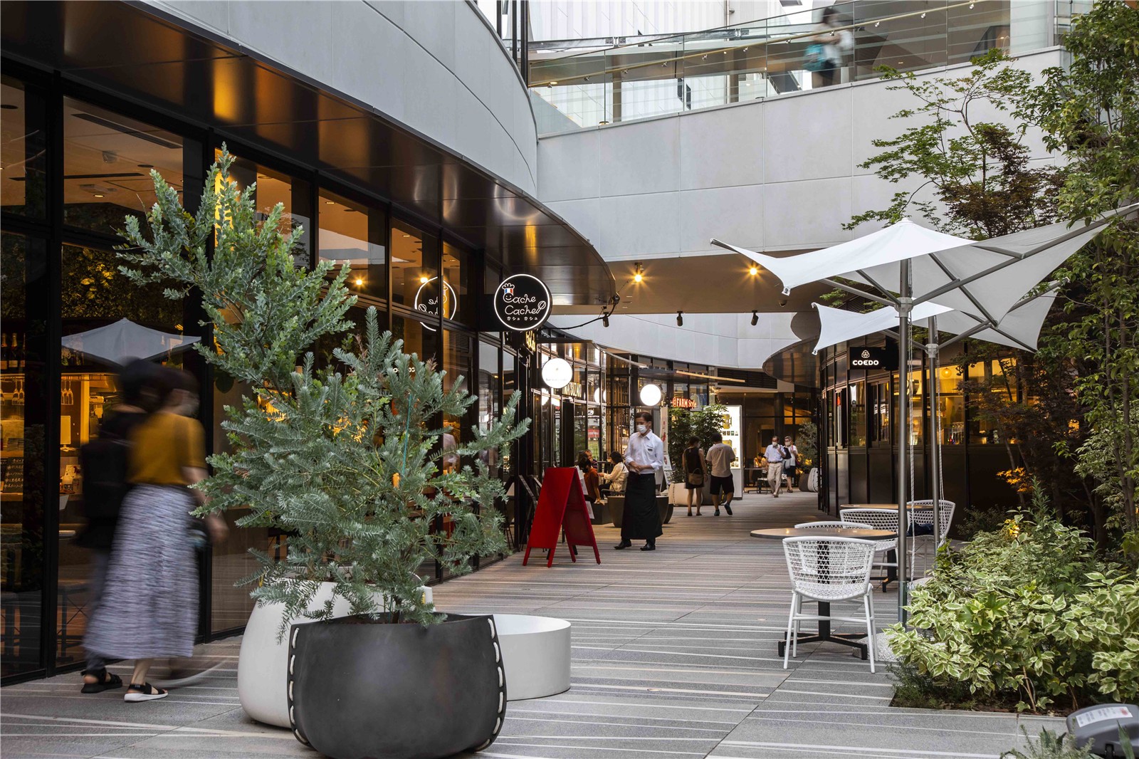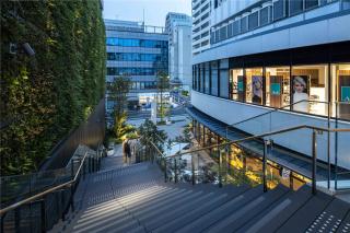 商業(yè)區(qū)的1F、2F在室內(nèi)外設(shè)置了座椅,鋪裝采用塑形混凝土構(gòu)成的大規(guī)格地磚。