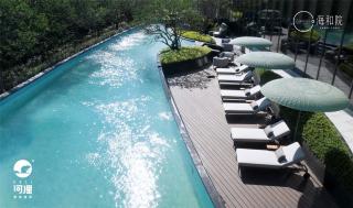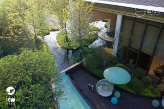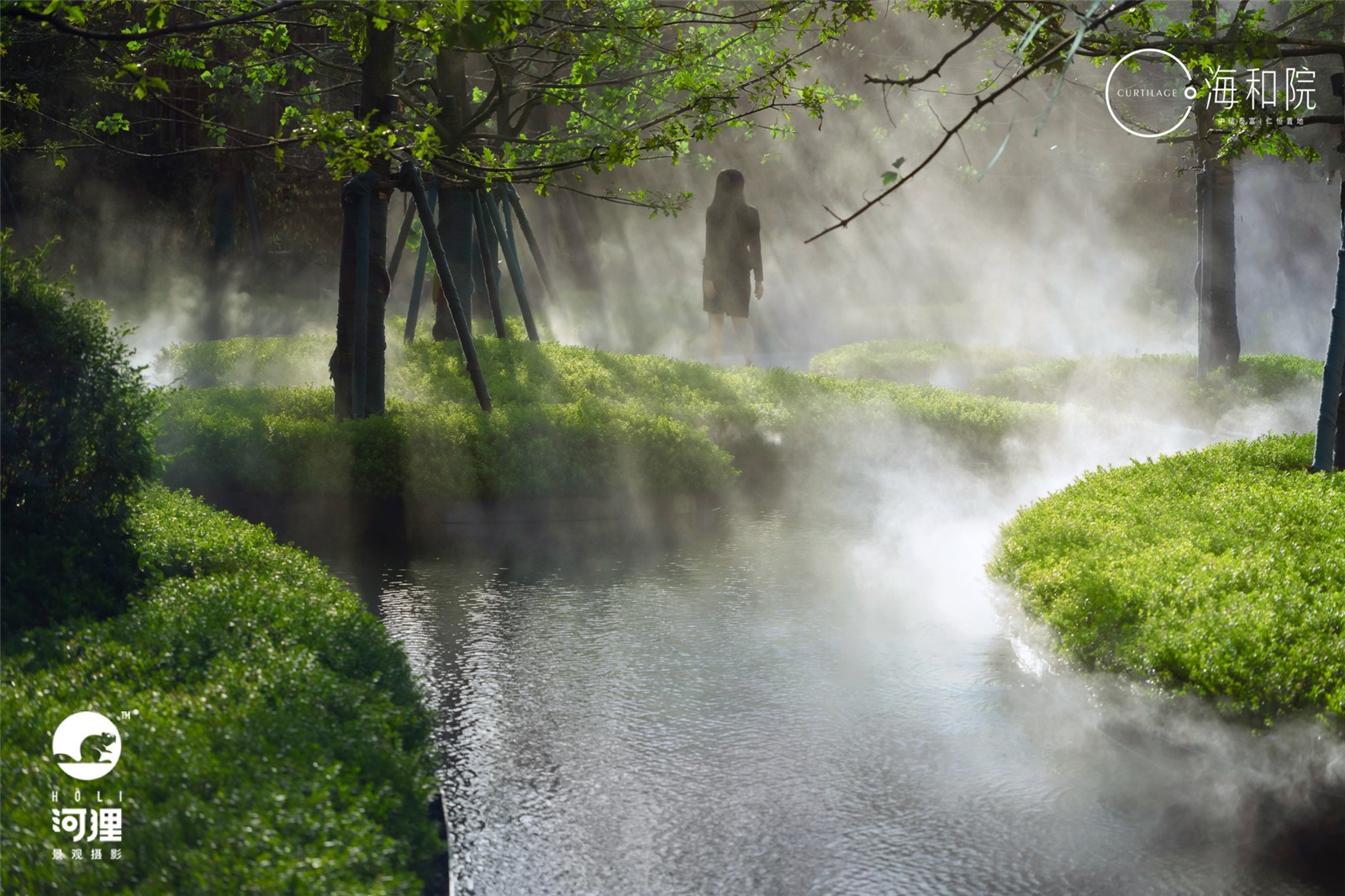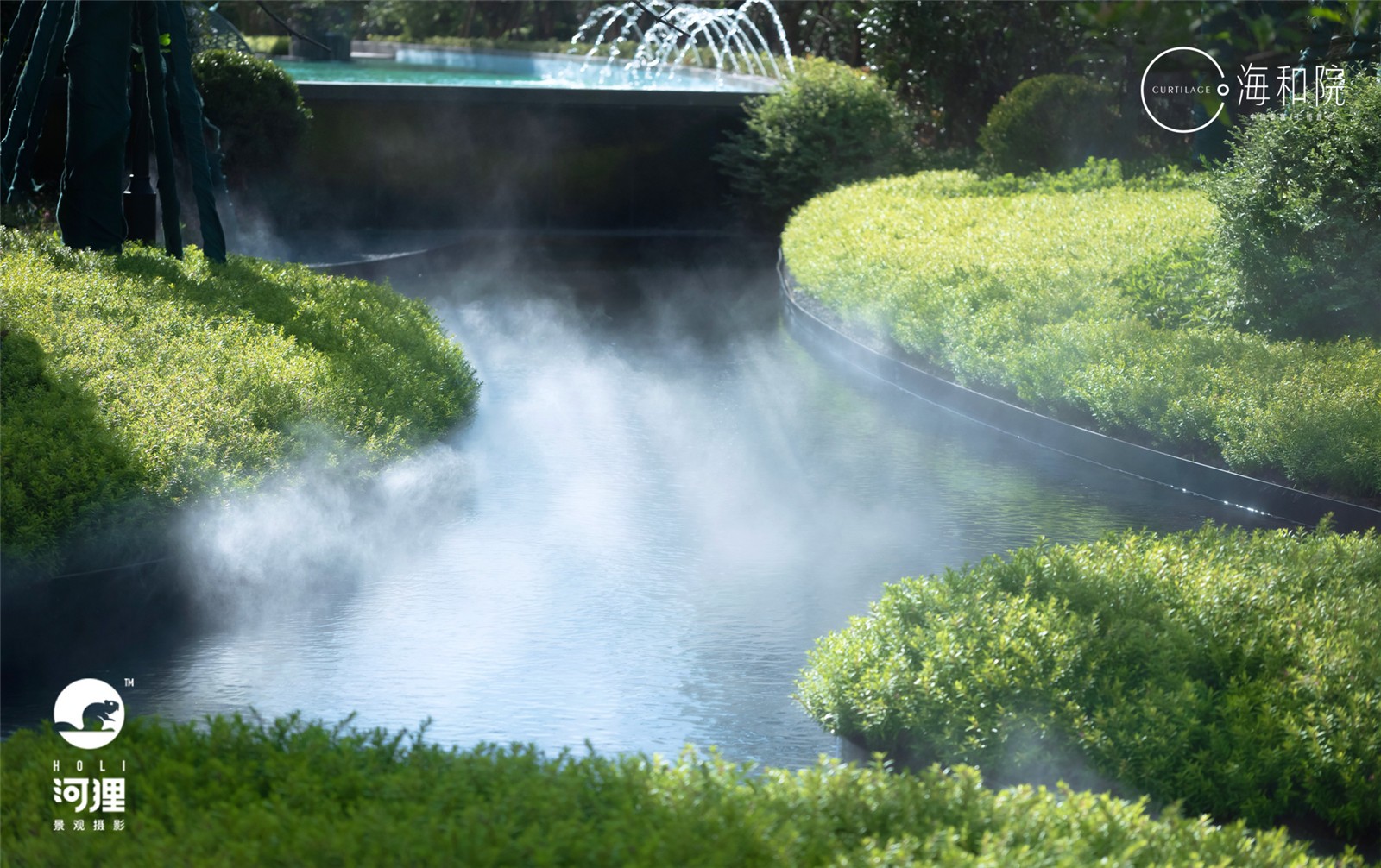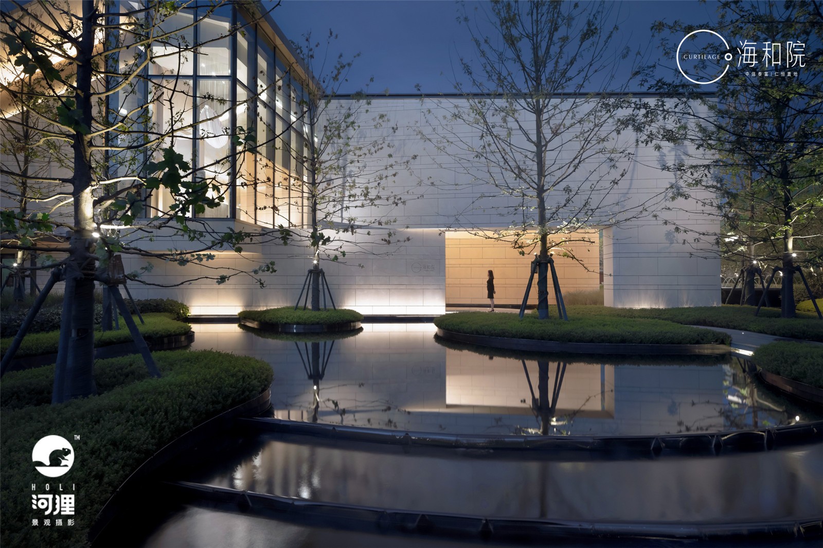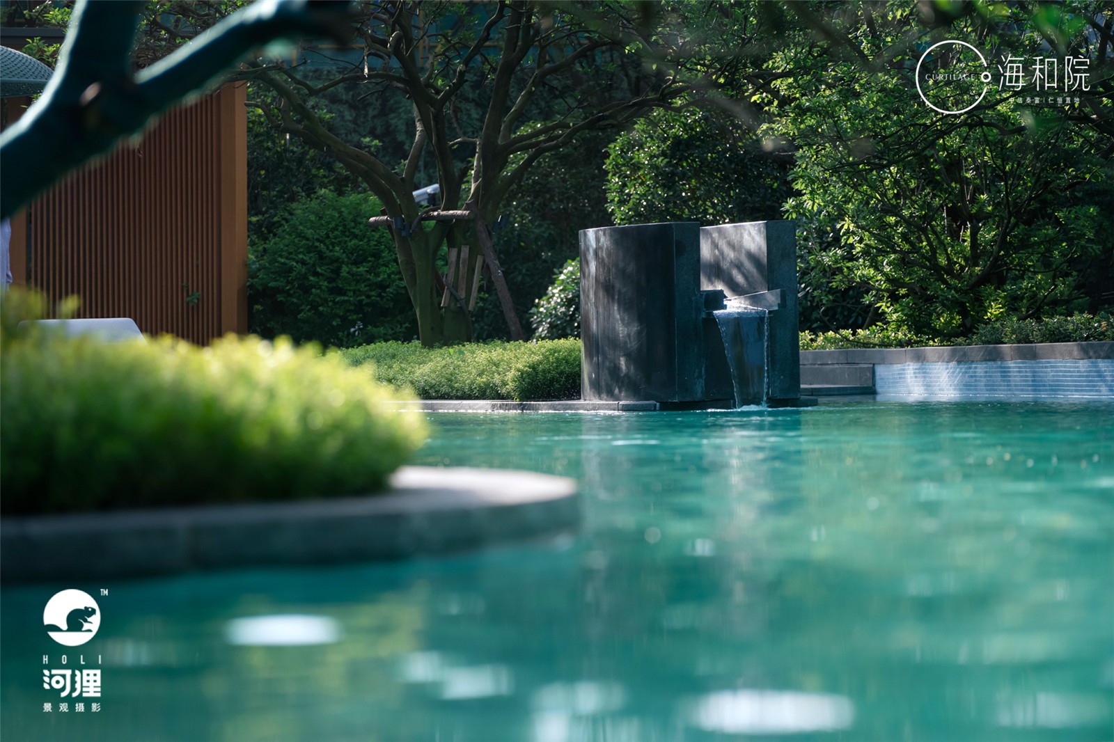 簡潔的入口大堂以障景手法,引導(dǎo)人的視線與動線,通過入口門扉,開闊的疊水水景,在婆娑的樹影下,伴著潺潺的流水聲,營造出一片自然之景,漫步其中,步移景異,宛如置身一片原始的森林之中。