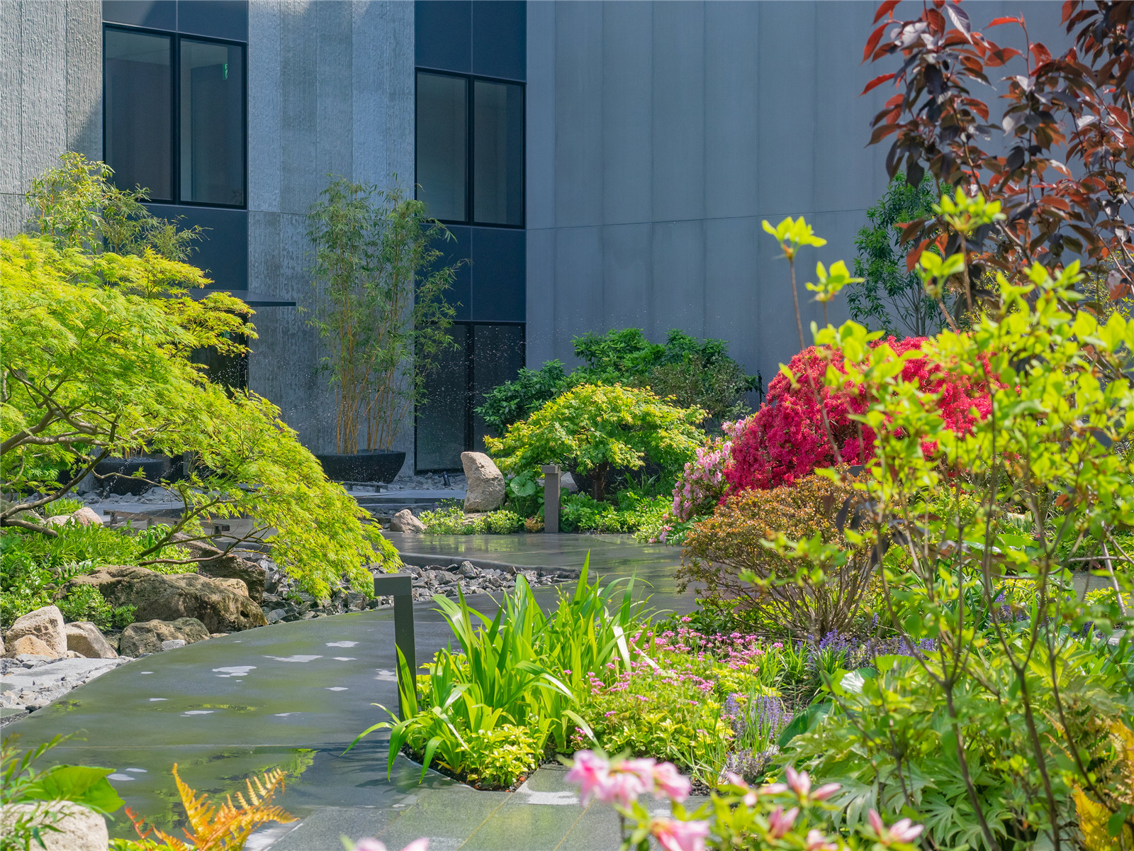 展示區(qū)景觀設(shè)計以“山明水秀之庭”為主題,旨在營造貼合“酈園”之名贊美自然的優(yōu)美戶外空間。無錫在自然縈繞的環(huán)境中孕育文化,無錫的自然與人們的生活有著密不可分的聯(lián)系,此次的目標(biāo)是在現(xiàn)代化的住宅環(huán)境中,時尚、美觀、高品質(zhì)地呈現(xiàn)出這種聯(lián)系。