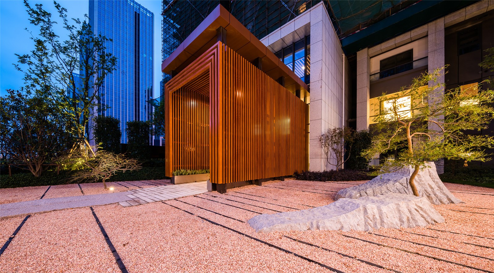 自然與生活的緊密聯(lián)系可以說是無錫現(xiàn)代化繁榮的基礎(chǔ)。設(shè)計時,將原本的自然山水通過禪意風(fēng)格以現(xiàn)代手法呈現(xiàn),將現(xiàn)代生活中與自然的接觸融于展示區(qū)。在呈現(xiàn)展示區(qū)高品質(zhì)景觀的同時,也給參觀者提供心曠神怡的享受。