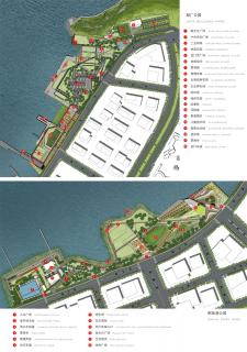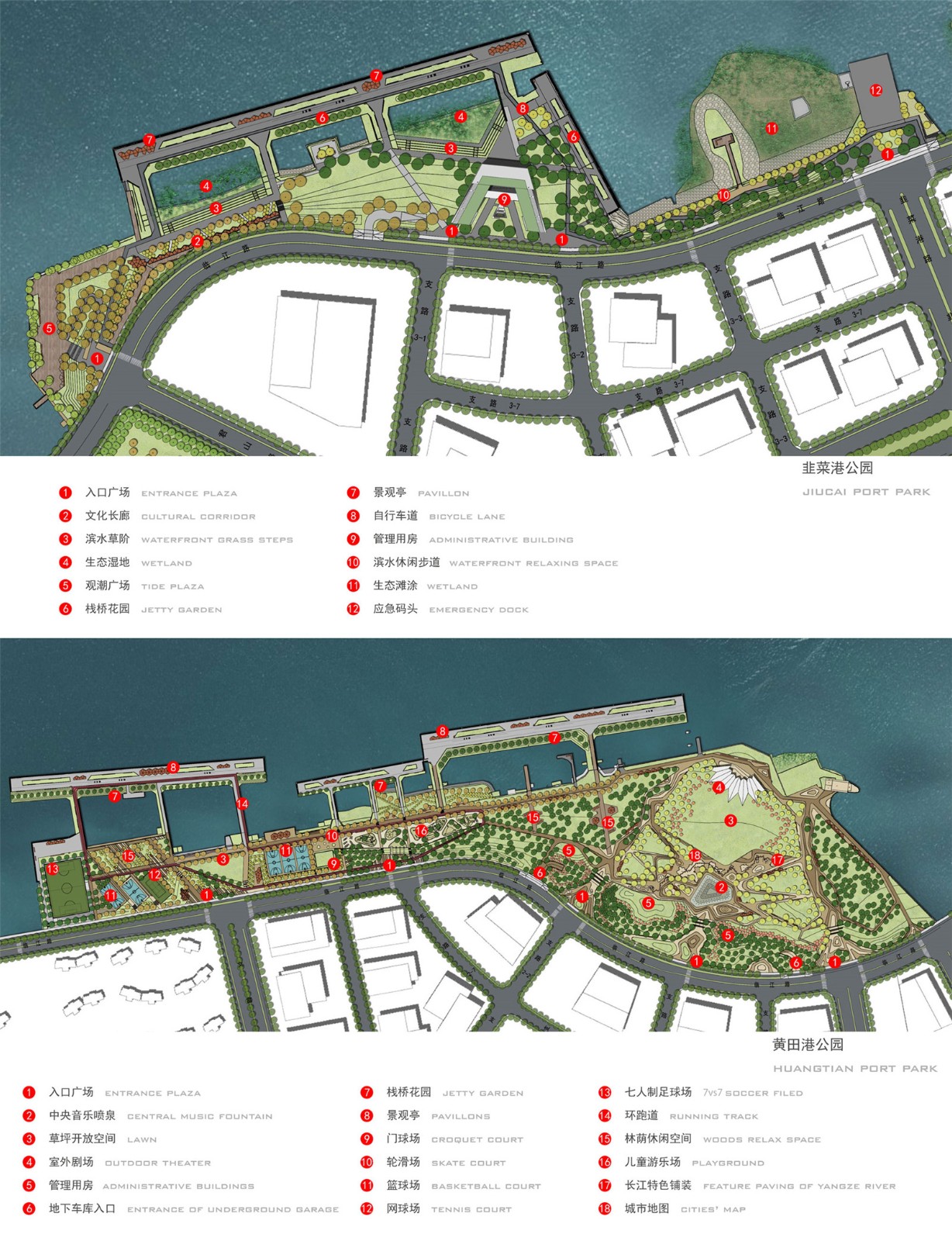 功能項(xiàng)目: 可持續(xù)城市排水系統(tǒng)、城市花園、生態(tài)濕地、公共綠地、工業(yè)遺跡保護(hù)、廣場(chǎng)、應(yīng)急碼頭、兒童游樂(lè)場(chǎng)、極限運(yùn)動(dòng)場(chǎng)、網(wǎng)球場(chǎng)、籃球場(chǎng)、門(mén)球場(chǎng)、乒乓球場(chǎng)、足球場(chǎng)、室外游泳池、室外劇場(chǎng)、慢跑道、自行車道、景觀亭、音樂(lè)噴泉、商業(yè)及服務(wù)配套建筑,以及游客中心。