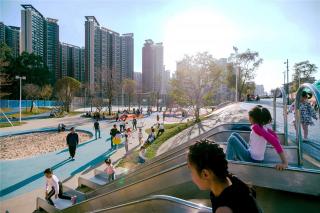 該公園面向全區(qū)不同年齡段的親子客群以及運動愛好者。在功能布置上,除了常規(guī)的小型足球場、極限籃球場、活力網(wǎng)球場以外,還增添了多功能運動場、滑板場等,把休閑運動和極限運動場所穿插融合。在設(shè)計中,設(shè)計師充分考慮了光照和各種運動沖突的關(guān)系,將各個球場軸向偏移,避開南北方向,避免日出、日落時間段的陽光刺眼。