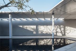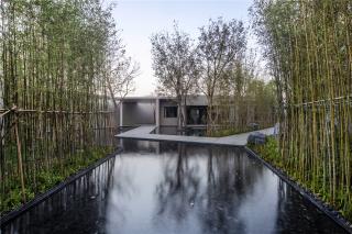 △鏡池上矗立的三棵松賦予了建筑宛若美術(shù)館的儀式感 Three pine trees standing on the mirror lake add a sense of ceremony to the architecture, as if it is an art gallery.