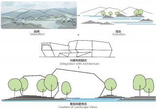The design concept of an open urban exhibition hall is closely related to Shiqi District of Zhongshan City. The features of numerous mountains and divergent streams are extracted and incorporated the concepts of water and stones unique to Shiqi culture.