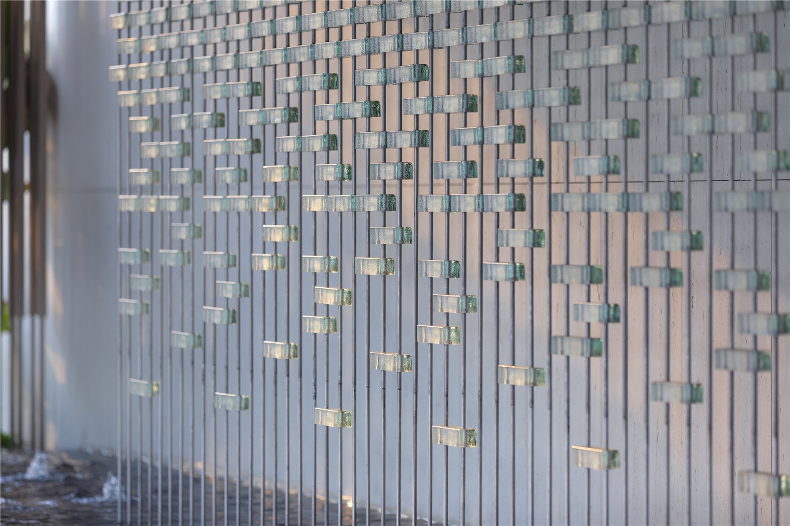 △精磨玻璃磚采用200x100x50標(biāo)準(zhǔn)化規(guī)格,以縱向不銹鋼條穿孔固定,不銹鋼封邊處理。為了整體比例和光影效果最佳,現(xiàn)場(chǎng)采用了多種規(guī)格和不同透明度的磚體組合打樣。墻內(nèi)安裝射燈,在夜景中發(fā)揮玻璃磚材質(zhì)的光影魅力。The polished glass bricks have the standard specification of 200x100x5 and are fixed by steel bars that pierce them vertically, with the stainless steel edge banding. To achieve the maximum proportion and light-shadow effect, the designer sampled tiles of different specifications and degrees of transparency. The spotlights installed inside walls emit the shiny charm of glass tiles amid nightly scenery.