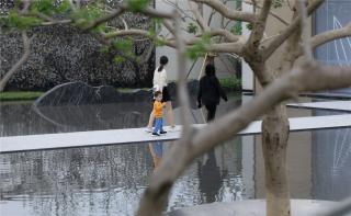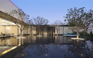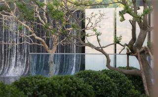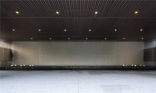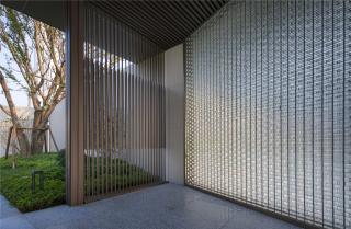 站在內(nèi)庭,身旁空無一物,又被萬物環(huán)抱,與天地同游。側(cè)耳聽,水流淙淙,流水板藏于一隅;有風(fēng)起,水波蕩漾,風(fēng)動(dòng)幕墻波光粼粼。