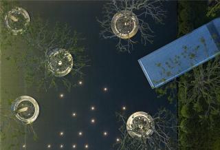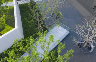 似是無意驚鴻一瞥的遇見,又像華麗樂章跳出的音符,斜向深處的眺臺(tái)漂浮在鏡面水景之上,看數(shù)棵鐵冬青優(yōu)雅生長(zhǎng),看云在水里面肆意變幻,清風(fēng)拂面,閑適愜意。