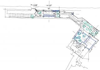 Standing here, you can vaguely see twigs wave behind the wall, which extends the space. Ascending the stairs, you will find noises cast behind you and start a dreamlike stroll on the flowery path amid green trees.