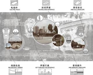 現(xiàn)狀:界面處受市政行道樹遮擋,南面開口受市政圍欄限制,轉(zhuǎn)角處有三棟居民樓,場(chǎng)地內(nèi)有高壓電線桿,圍墻及市政綠化、鋪裝雜亂老舊。
