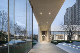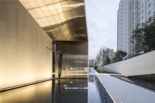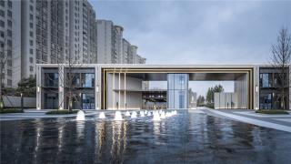 入口的設(shè)計(jì)將建筑元素與空間秩序進(jìn)行結(jié)構(gòu)重組,以現(xiàn)代幾何理念,對(duì)橫向空間無(wú)限延伸,形成超序列展示界面,與城市空間在視覺(jué)消失點(diǎn)融合,更加凸顯高貴、雅致,具有百看不厭的形式美。