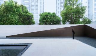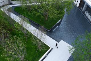 循著光影的線條踏山而行兩片斜墻咬合、交錯(cuò),似穿行于峽谷間倏忽,建筑如畫(huà)卷般慢慢在眼前舒展 伴隨著潺潺的水聲悠揚(yáng)流長(zhǎng)造型草坡如雕塑般漂浮在空間里枝影呼應(yīng),牽心杳然