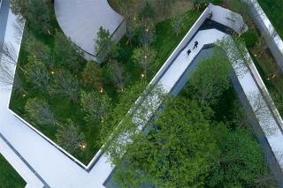 無(wú)限延展的斜面草坡和墻體交錯(cuò)共生讓建筑若隱若現(xiàn)簡(jiǎn)潔而富有張力的引導(dǎo)界面將思緒拉向回憶的遠(yuǎn)方晨光灑落山林之間,萬(wàn)物蘇醒風(fēng)姿綽約的美國(guó)紅楓自由而爛漫的隨風(fēng)起舞仿若在訴說(shuō)著:“云輕揚(yáng),葉如剪,遙想往事如昨日”