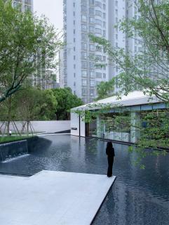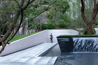 如鏡的水面倒映著樹(shù)影、日光、建筑,如夢(mèng)似幻一潭清水,一線落瀑,水中倒映的不僅是樹(shù)影更是對(duì)未來(lái)生活的潺潺寫(xiě)意。