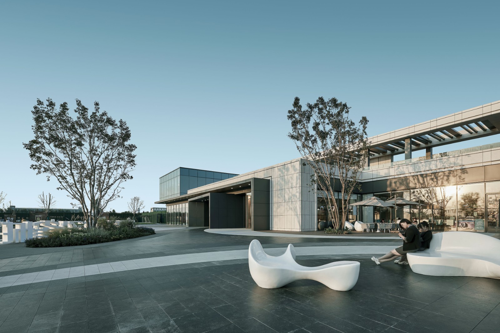 景觀設(shè)計從不是單維度的思考,這里我們將建筑的半室外空間也納入整個景觀氛圍的考慮范圍。時尚水吧在建筑二層屋頂,設(shè)置有戶外吧臺、外擺座椅、音樂舞臺等精品設(shè)施。在此,商業(yè)氛圍和生活體驗契合而相得益彰。河風(fēng)徐徐,聽著音樂,眺望河景,酌一杯小酒,這就是向往的生活。