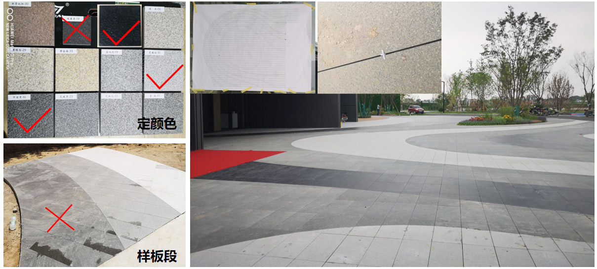 異型鋪裝紋理的延展不僅是“鯉魚躍龍門”的余韻,更是商業(yè)氛圍動感韻律的詮釋?,F(xiàn)場通過鋪設(shè)樣板段進(jìn)行排樣和對比,選定最合適的材質(zhì)和色彩,并且克服了陶瓷磚異型切割的難點(diǎn),才有了流暢的波紋曲線。