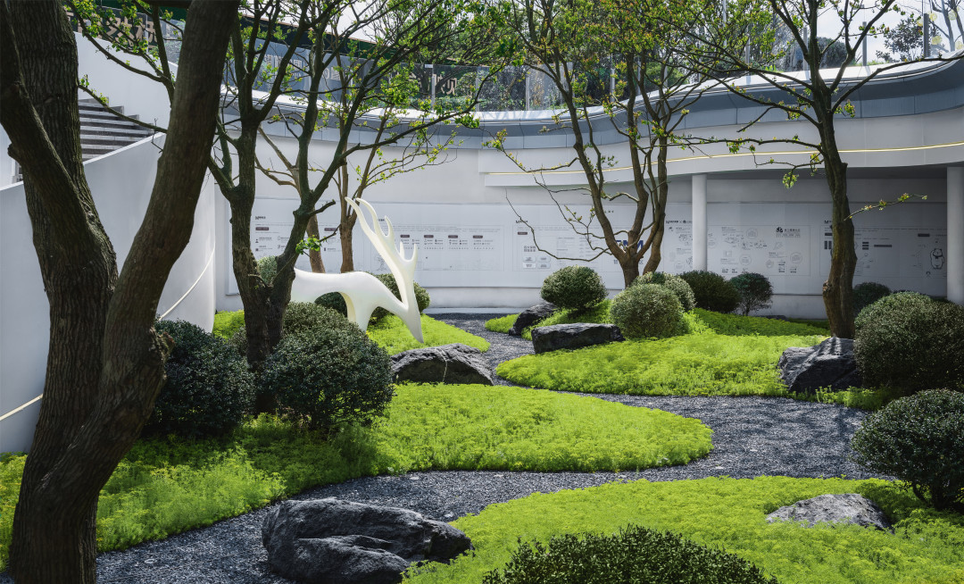 穿過售樓部大廳,沿著旋轉(zhuǎn)樓梯蜿蜒拾階而下,視線豁然開朗,透過落地窗發(fā)現(xiàn)了另一方自成一體的禪意森影天地:灰石碎粒,青青草叢,烏桕成林下,一只潔白的森林之靈麋鹿在淺吟低唱,感受、吮吸,借用青草之唇這體驗(yàn)人間歡樂。