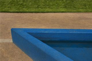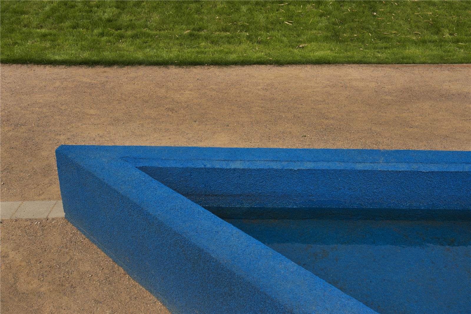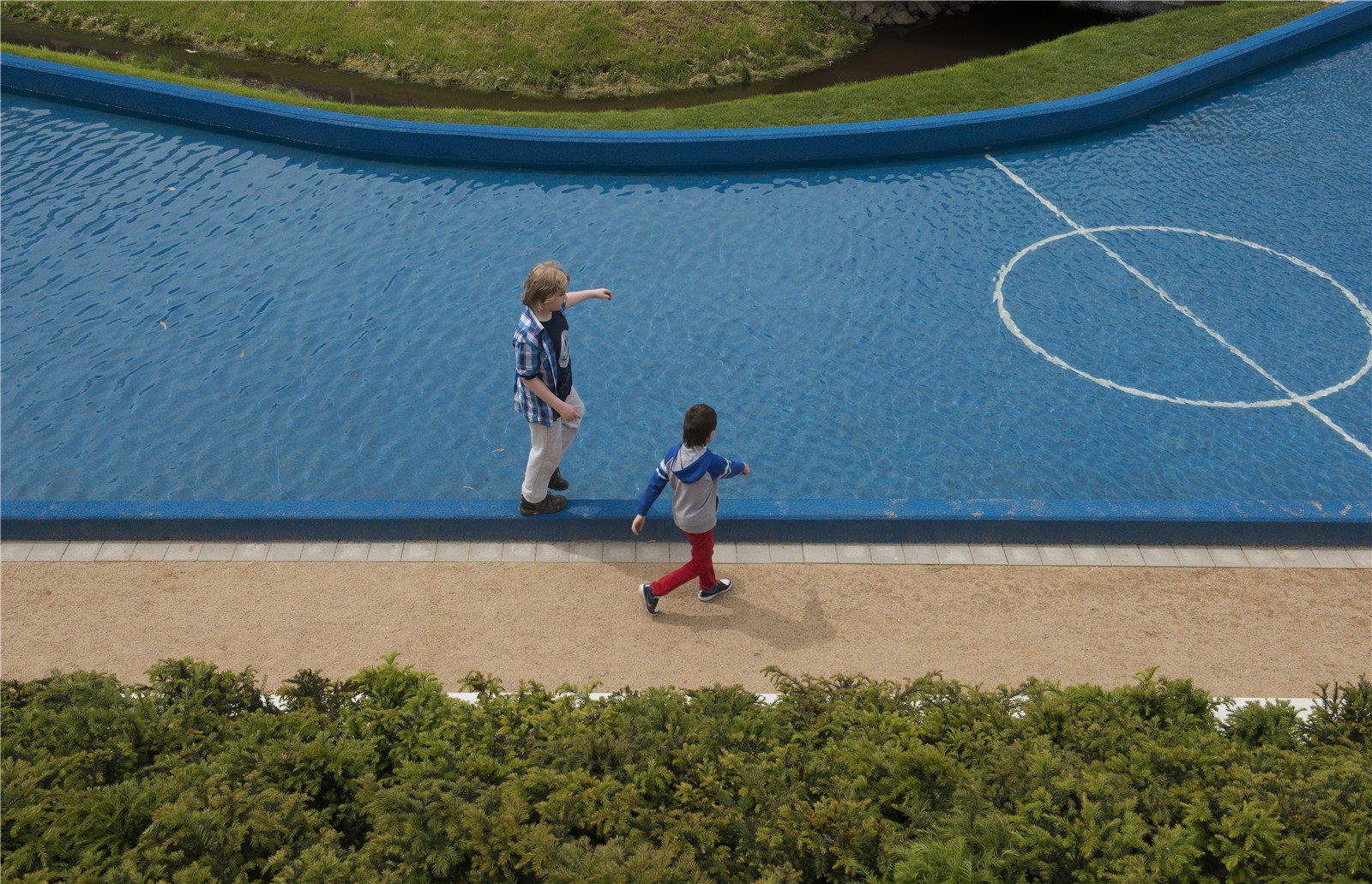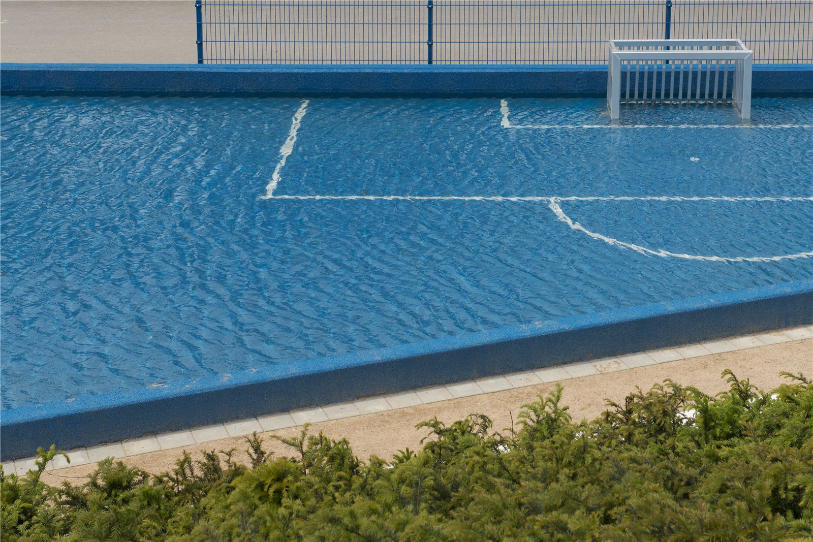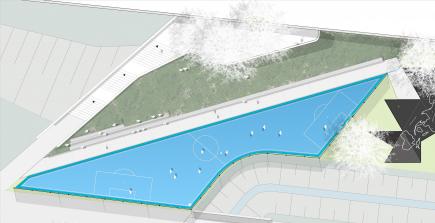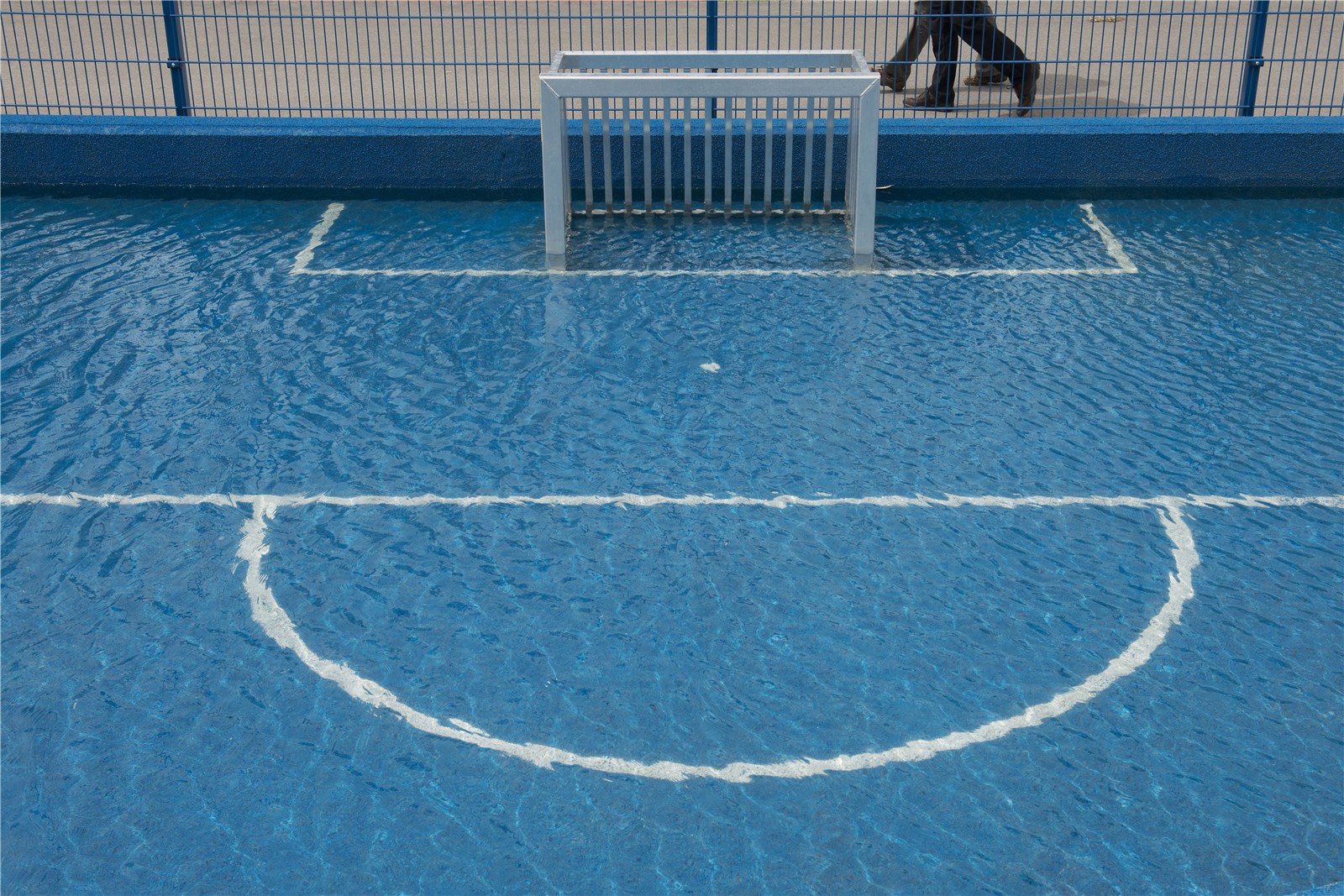 Conventional soccer is played on a flat rectilinear lawn with wide, straight shots made to opposing goal. At the Aqua Soccer installation, the field conditions of soccer are intentionally inverted; everything that was once simple is now a struggle: fast movements are difficult, straight shots are nearly impossible, the goals do not align with each other and the playing field is drastically narrowed. Most importantly, the field surface is rubberized and filled with water.