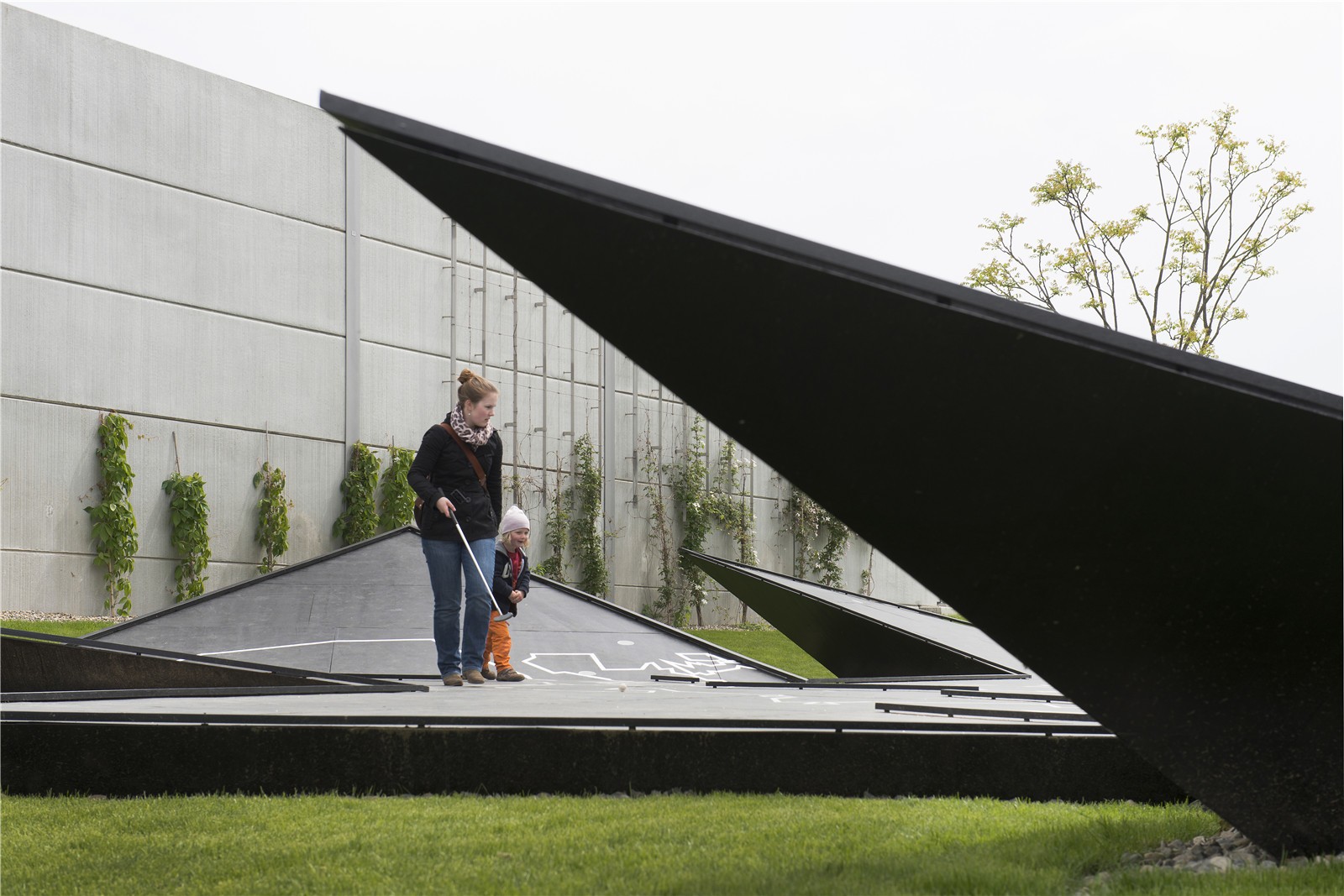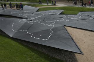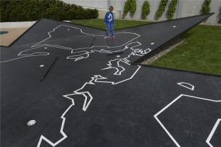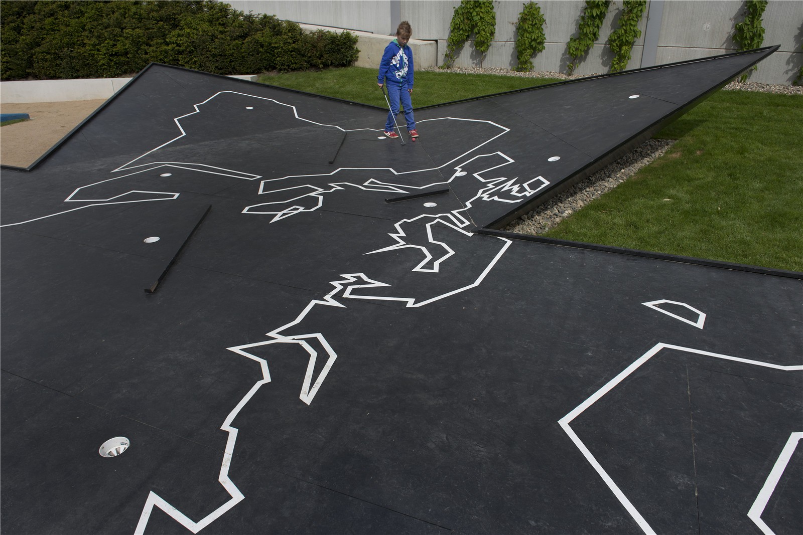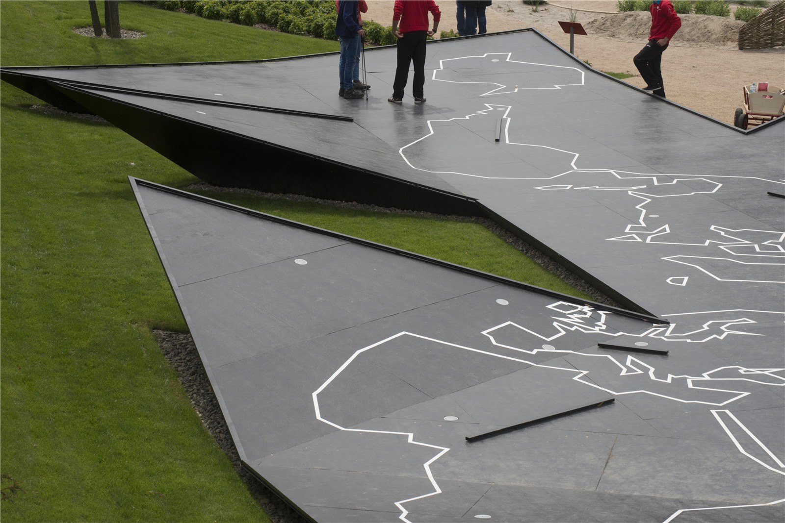 The Dymaxion golf in the garden 73 is a remix: the Unfolded Dymaxion World is the support field for the mini golf game. Continents and countries are successively played and conquered. As with “big” golf, water traps create obstacles to the game. The folded triangles of the world map consist of reinforced, lightweight concrete stilts, hovering over the lawn area.