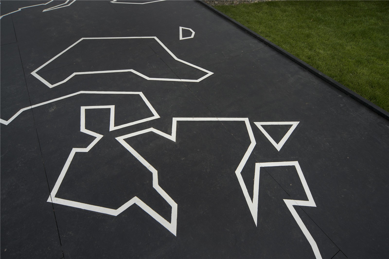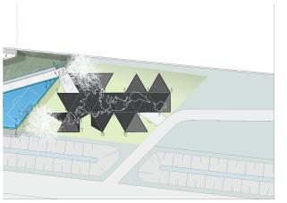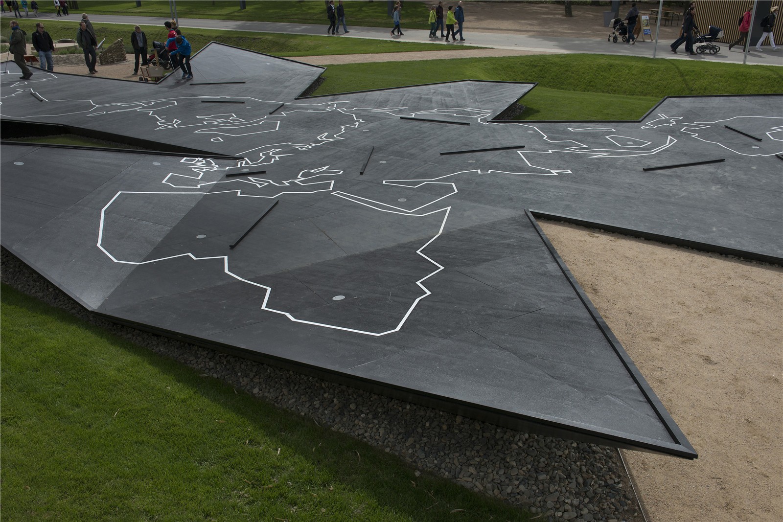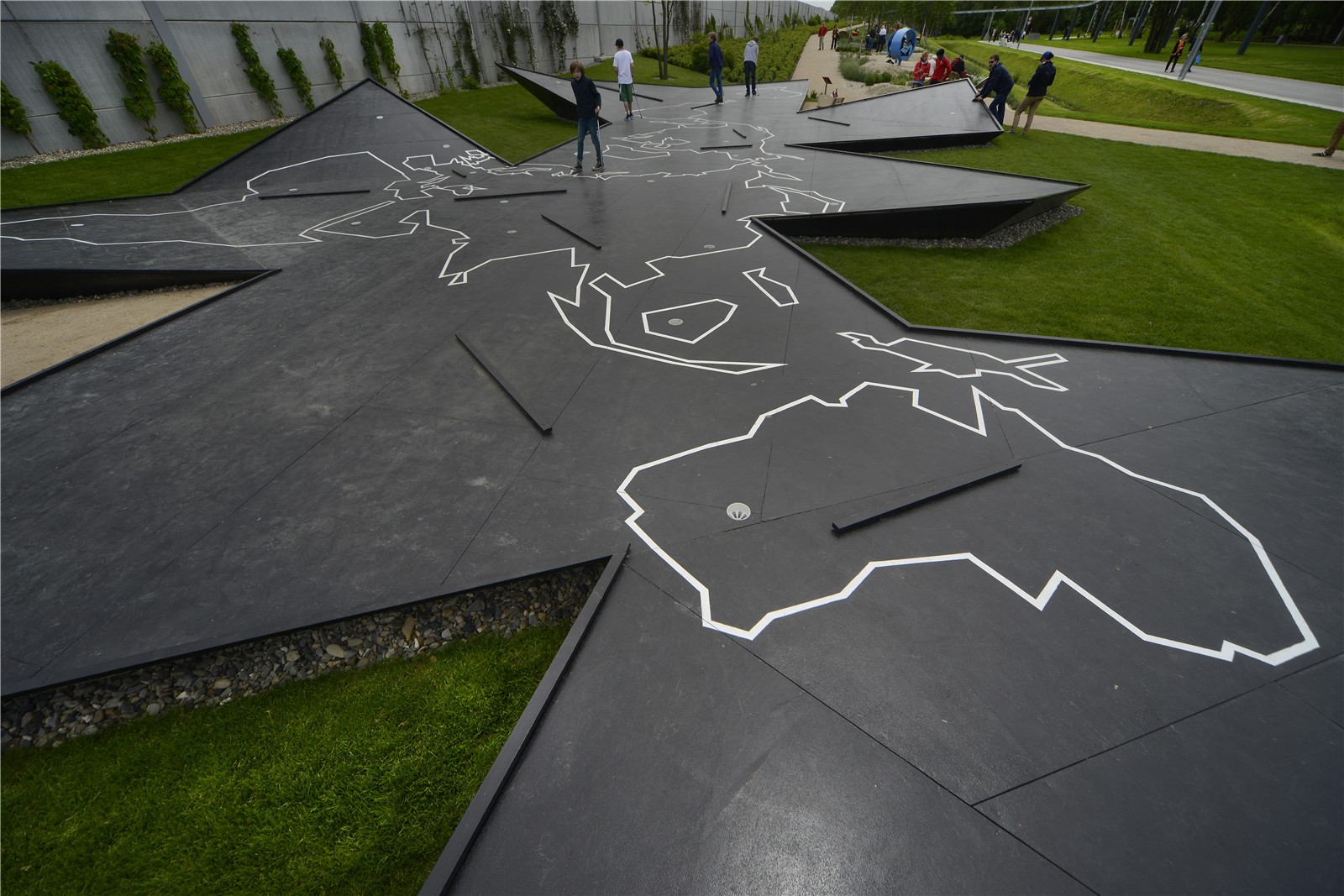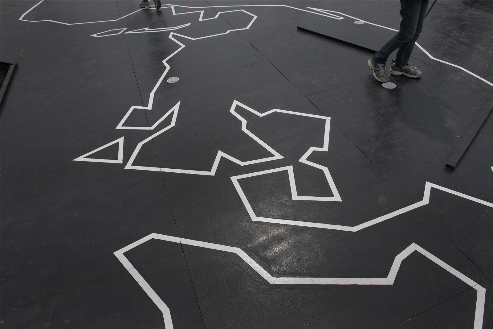 The Dymaxion golf in the garden 73 is a remix: the Unfolded Dymaxion World is the support field for the mini golf game. Continents and countries are successively played and conquered. As with “big” golf, water traps create obstacles to the game. The folded triangles of the world map consist of reinforced, lightweight concrete stilts, hovering over the lawn area.