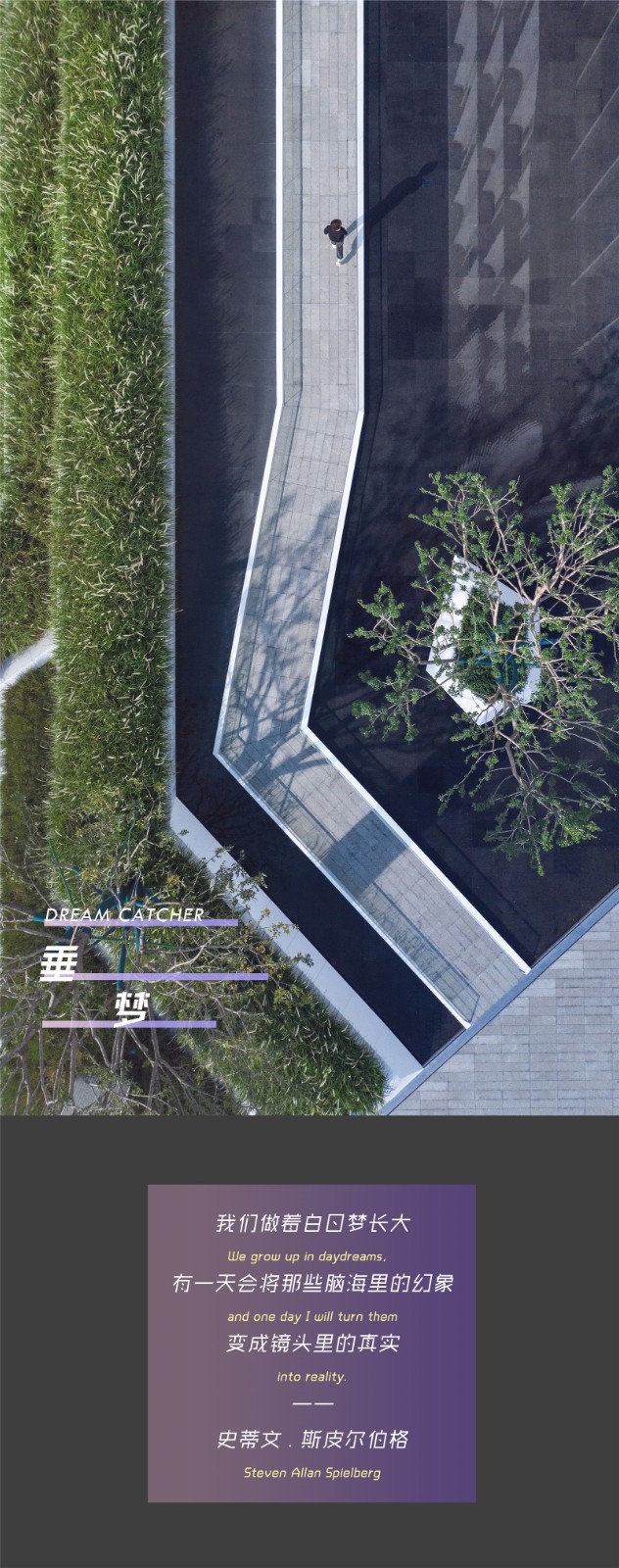 項(xiàng)目為商業(yè)辦公綜合社區(qū),客群面向在外拼搏追求夢(mèng)想的年輕人。設(shè)計(jì)師以好萊塢電影公司夢(mèng)工廠的logo為靈感,以其靈魂人物導(dǎo)演斯皮爾伯格不同人生階段的代表作品為藍(lán)本,以現(xiàn)代極簡(jiǎn)手法將場(chǎng)地打造為一個(gè)充滿未來(lái)感的夢(mèng)幻空間。